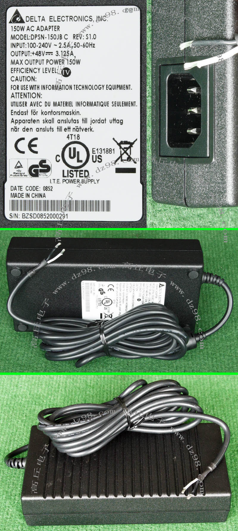 全新无包装,外观约9.8成新,输入交流电源100-240V,输出直流电压48V,电流3.125A,最大短时间功率150W。电源外形尺寸:170x85x42毫米,重量约840克。 输入插口:标准电脑主机插座(卖出没有配插头线),输出输出线长度达2.7米。 |