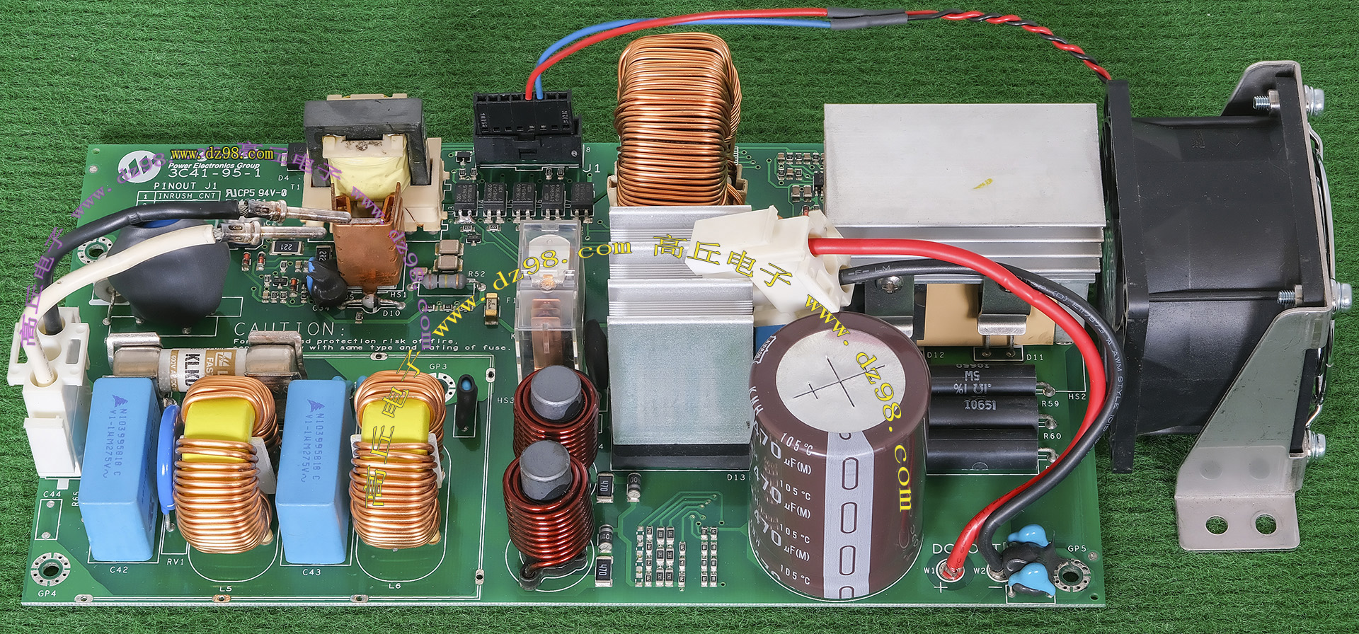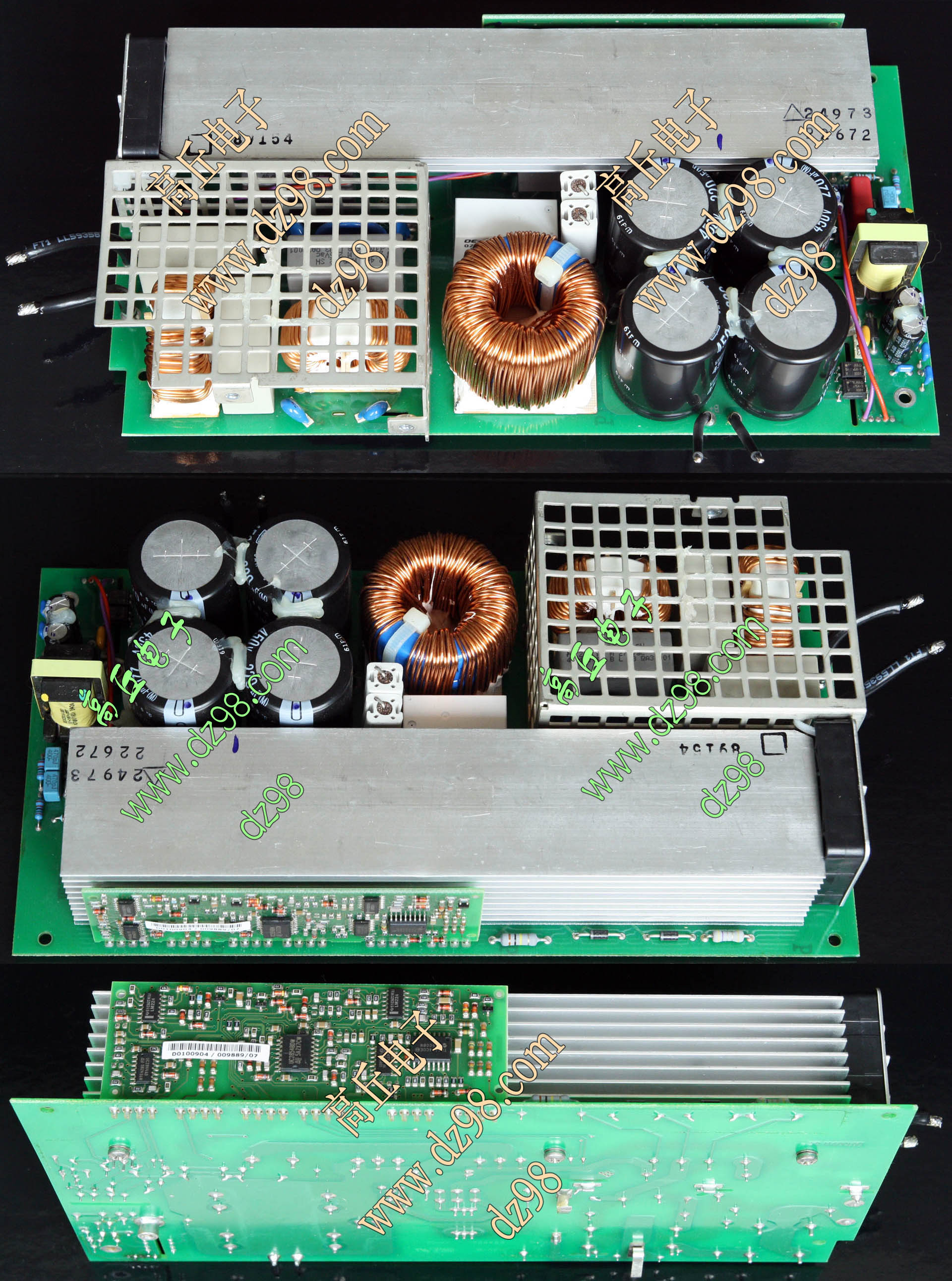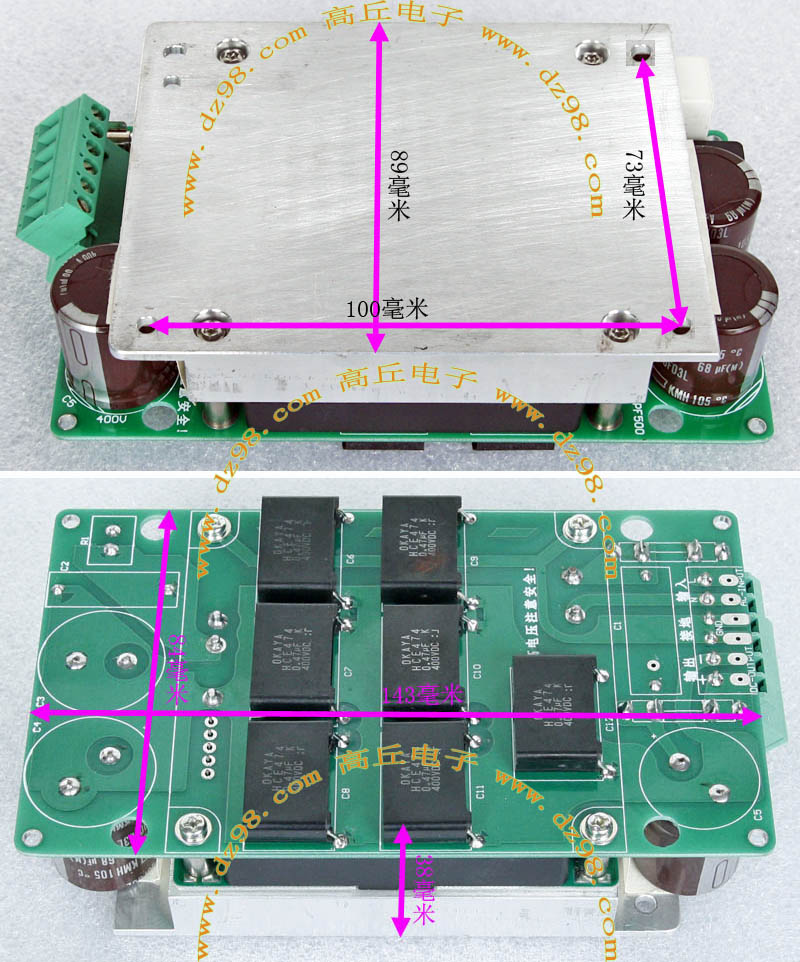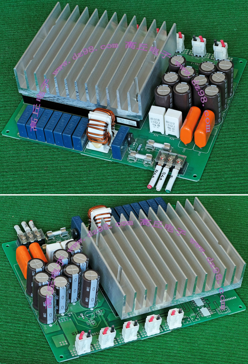145mm x 100mm,重量约3000克。 内部装配75A-800V单三相两用整流桥,8只400V-820UF电容,交流输入滤波电流,PFC大电感,开机缓冲击延迟电路。 |