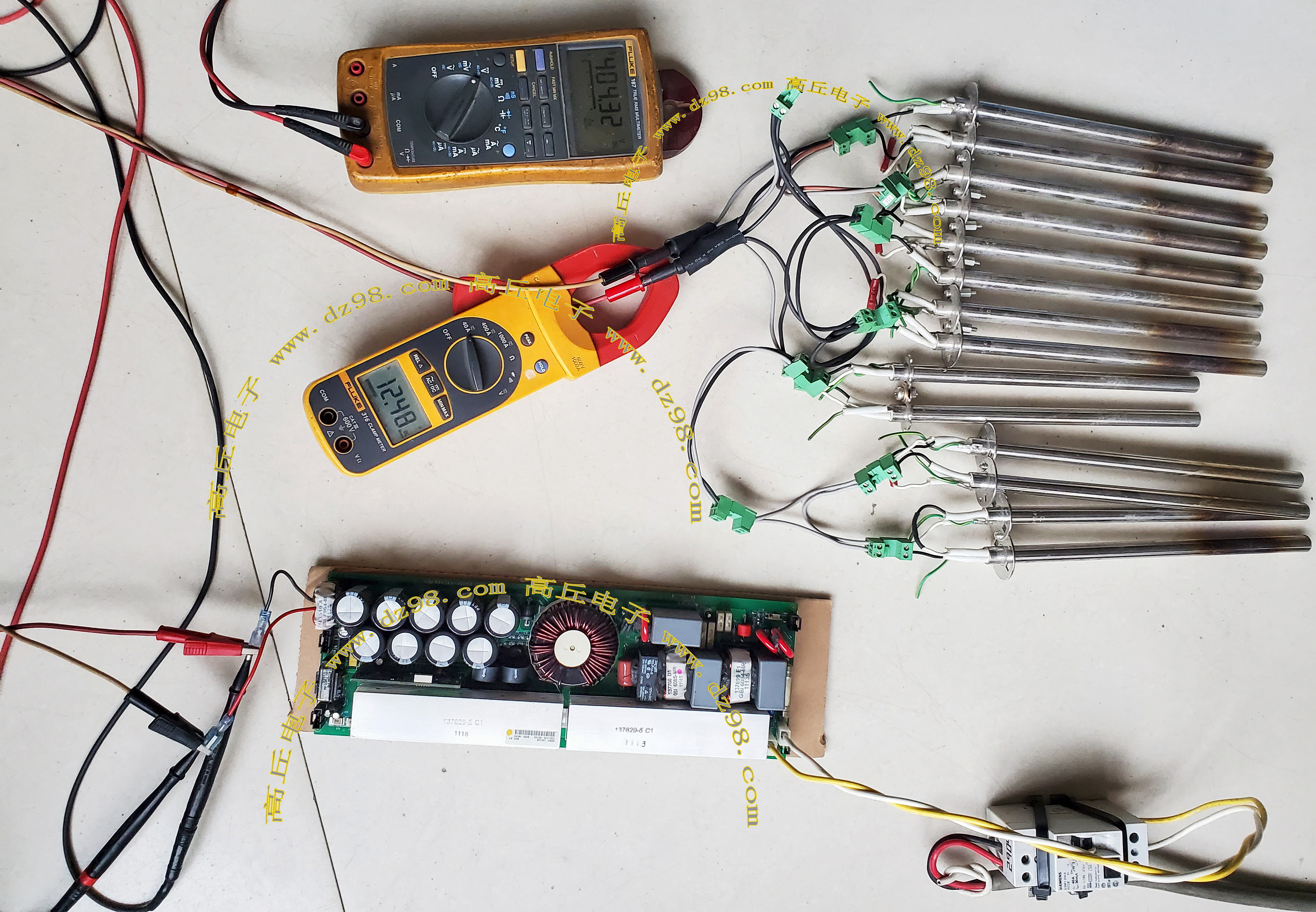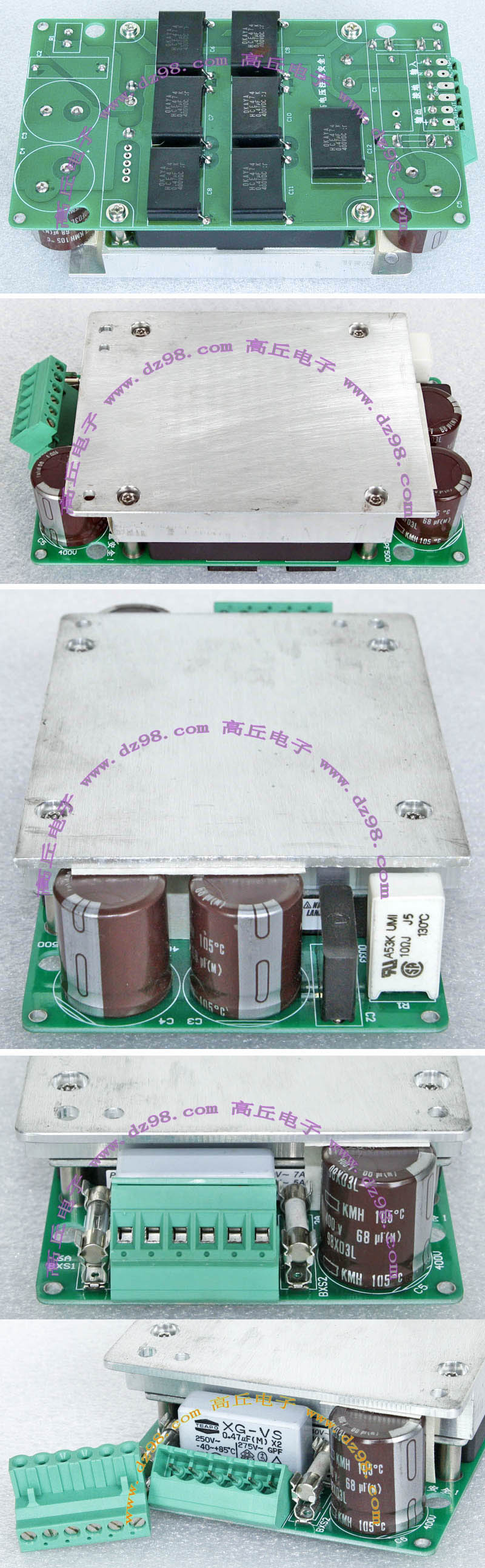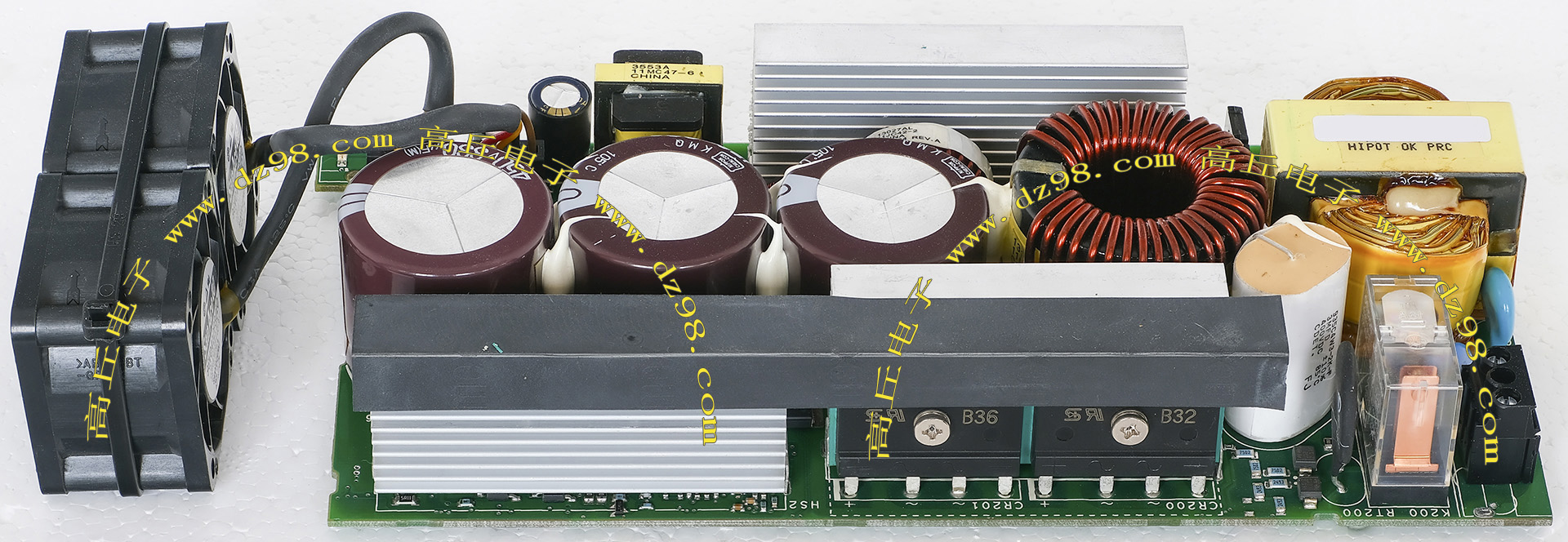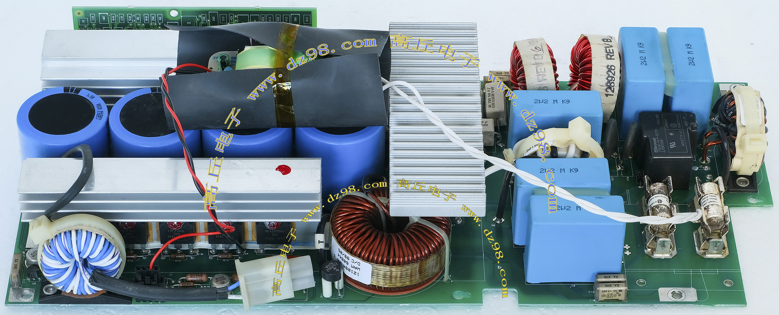 145mm x 100mm,重量约3000克。 内部装配75A-800V单三相两用整流桥,8只400V-820UF电容,交流输入滤波电流,PFC大电感,开机缓冲击延迟电路。 |