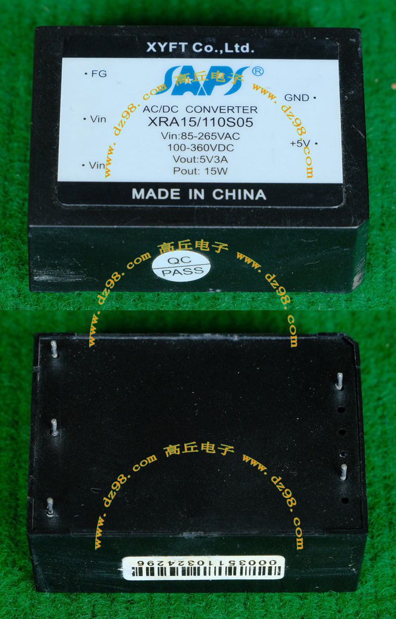 | XRA15/110S05 85-265V转5V 3A 15W AC/DC电源模块AI67 | 拆机件 | 外形尺寸;长62毫米,宽度45毫米,厚度23毫米。重量约90克。 |