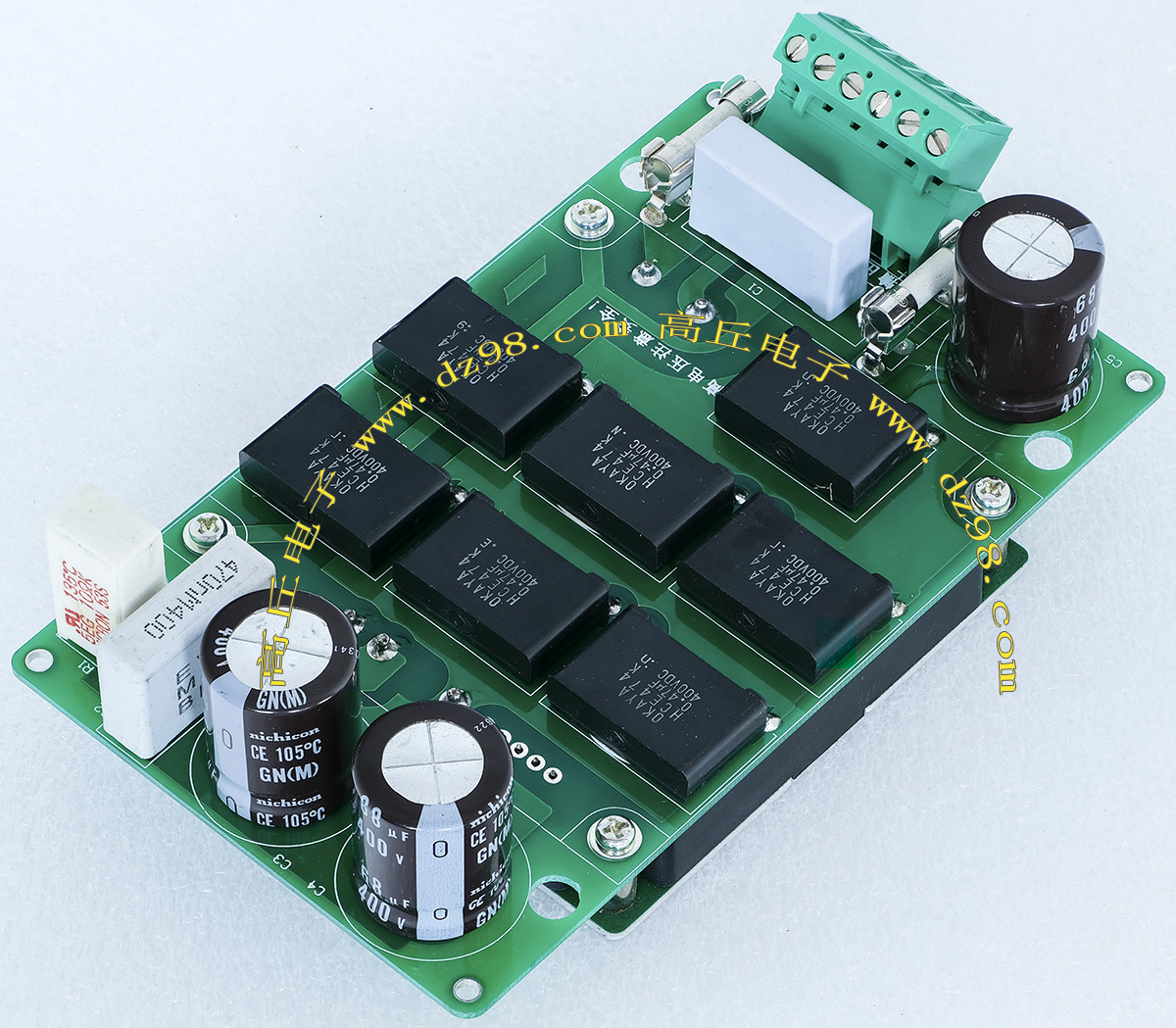 全新拆机件 | 在全新开关电源拆下,输入AC110V-220V自动切换,只接三条线, 两条接AC电源输入,另一条接两只200V电解电容串联的中点,线路板上的可控管是16A的,估计对500W以内电源使用没问题。 |