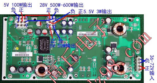 拆机件 标号JW060ABK,输入电压范围36V-72V,输出DC正5V、5A,DC正12V、1.45A,DC负12V、1.45A,总功率60W。