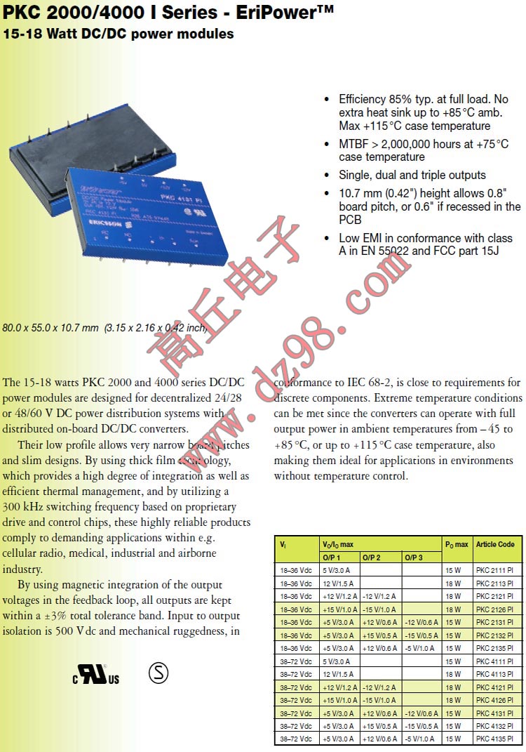 ERICSSON爱立信PKR4622PI 36-75V转正负5V 0.6A 6W电源模块AKA042 全新 具体规格看PDF文件 ERICSSON爱立信PKF4121A SI 36-75V转正负12V 10W电源模块AKA041 数量24只