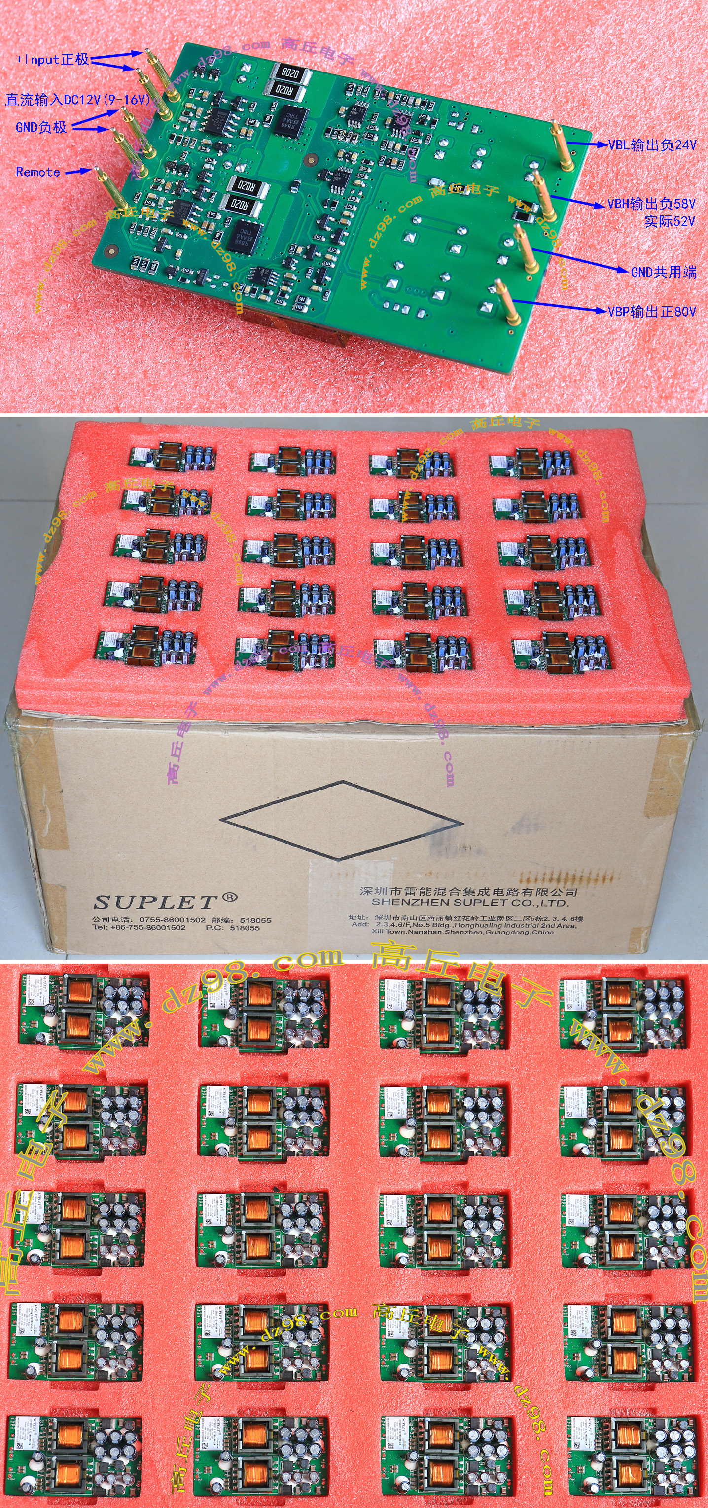 全新 | 全新原装,输入电压9-16V,共3路输出;输出电压正80V,标称电流0.25A,最大短时间输出电流达1A、负24V,标称电流0.7A, 最大短时间输出电流达1.8A、标称负58V实际电压是52V,标称电流0.7A, 最大短时间输出电流1A、把正80V和负24V端子接出可当单路输出104V、也可把正80V和负52V端子接出可当单路输出132V。 接线图看详细图片,外形尺寸:长度80毫米x宽度47毫米x高度16毫米(连镀金铜针总高度32.5毫米),重量约59克。 |
