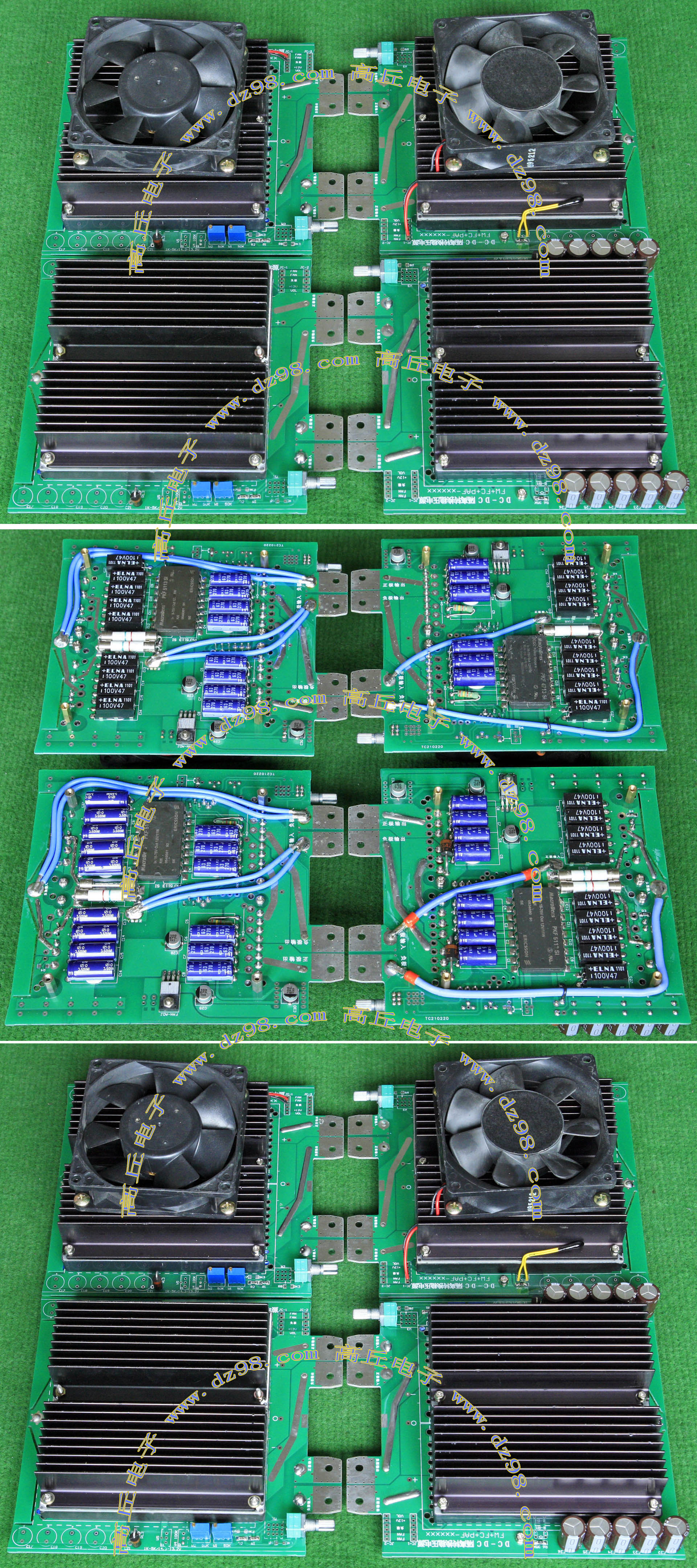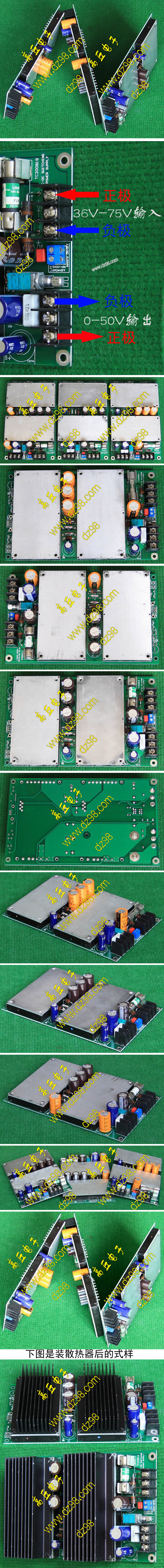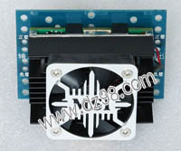 已组装为成品的模块电源,包含必须的输入和输出电容(元件根据不同批次变更),装配调压电位器,对应输出电压从0V-50V可调。输入电压高于19V启动,高于20V满载输出,简单接线:输入2线接直流电源(正负极性不可接反),输出2线接负载。 | 单价270元。 带散热器和风扇300元。 |