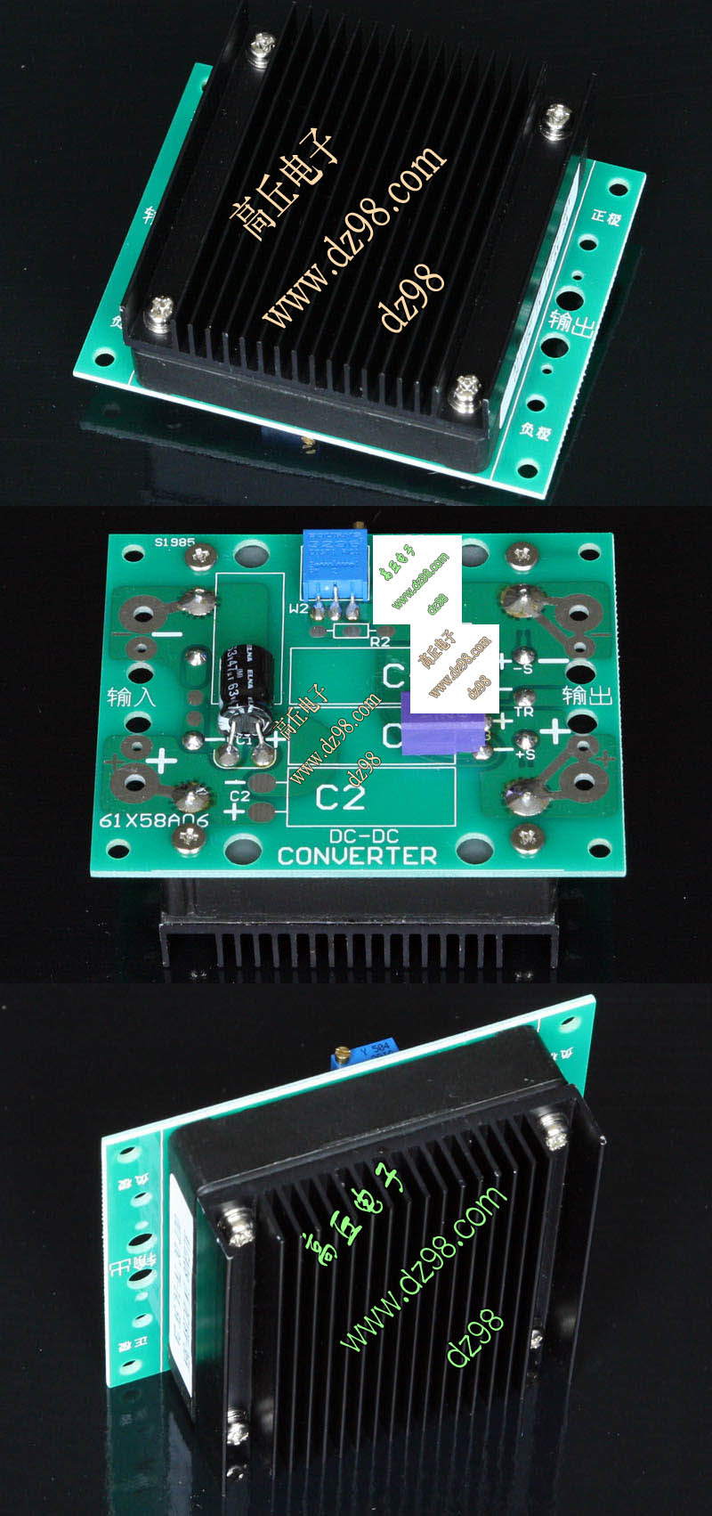 已组装为成品的模块电源,包含必须的输入和输出电容(元件根据不同批次变更),电路板装有电位器,对应输出电压从0V-50V可调。简单接线:输入2线接直流电源(正负极性不可接反),输出2线接负载。 |