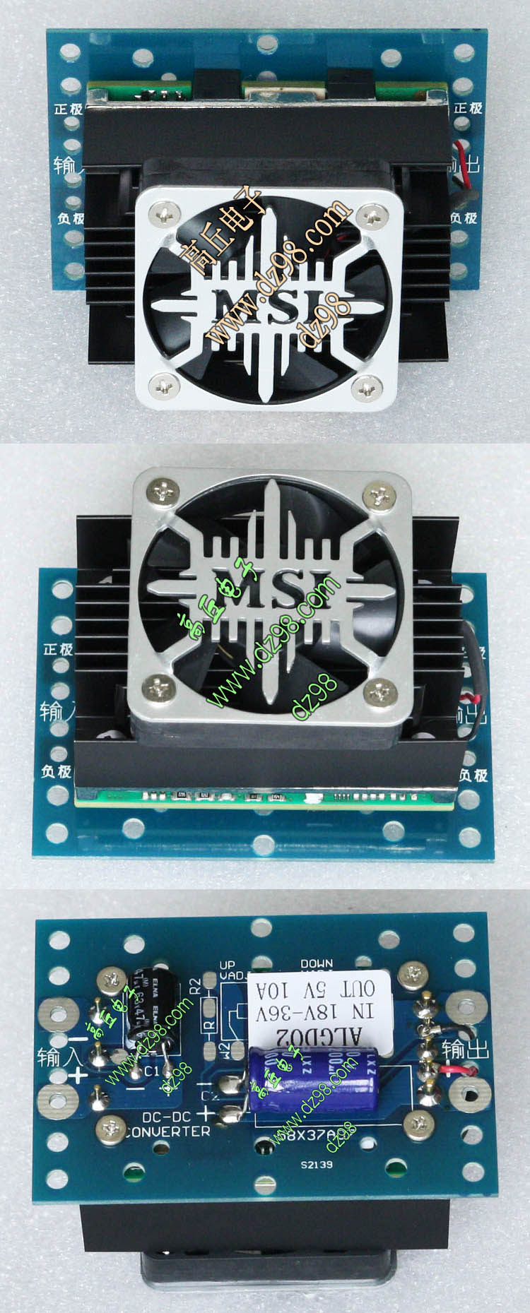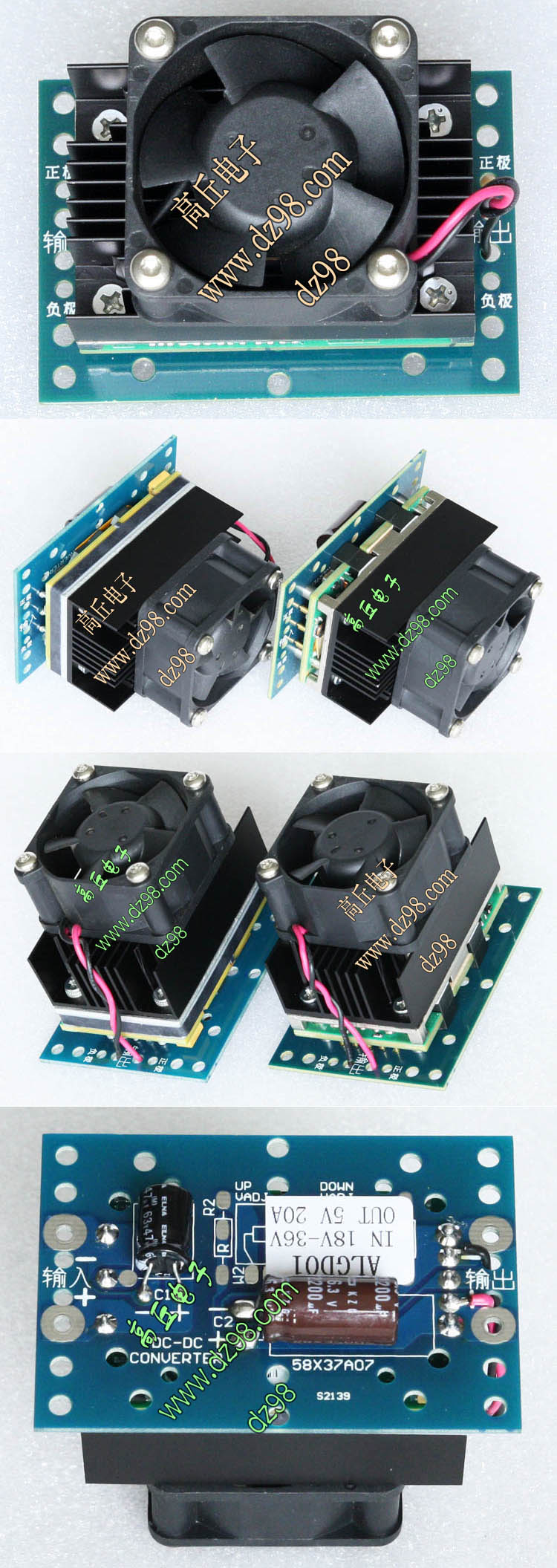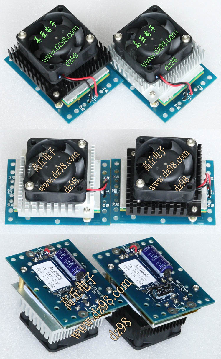 已组装为成品的模块电源,包含必须的输入和输出电容(元件根据不同批次变更),装配调压电位器,对应输出电压从0V-50V可调。输入电压高于19V启动,高于20V满载输出,简单接线:输入2线接直流电源(正负极性不可接反),输出2线接负载。 | 单价350元。 带散热器和风扇380元。 |
