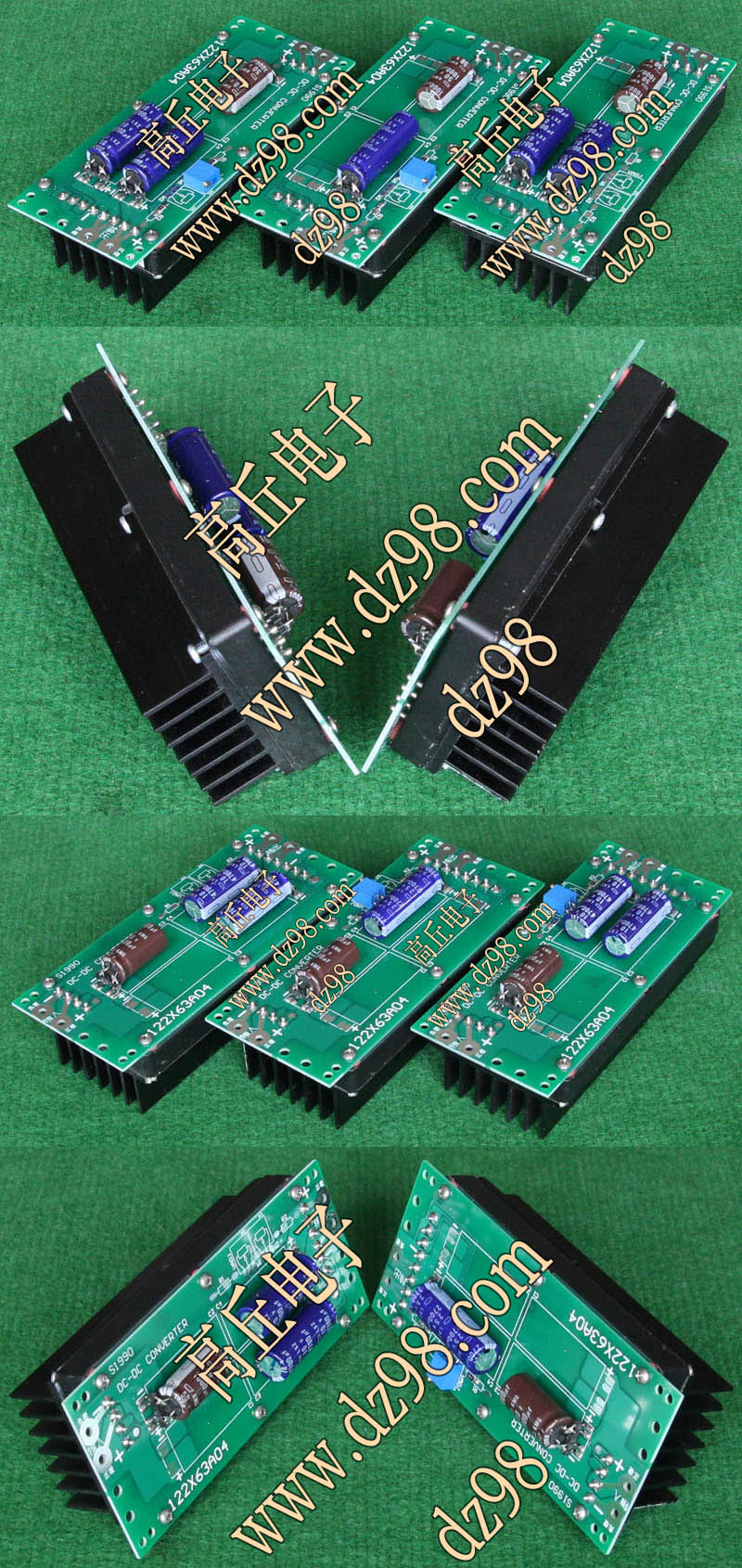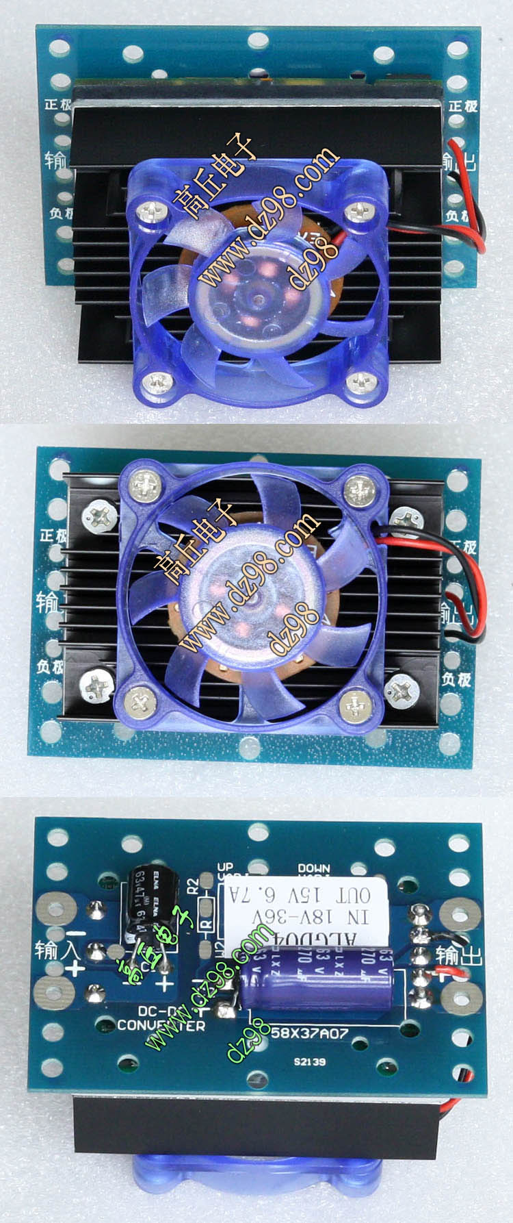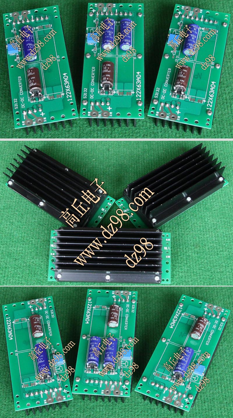已组装为成品的模块电源,包含必须的输入和输出电容(元件根据不同批次变更),装配调压电位器,对应输出电压从0V-60V可调。输入电压高于19V启动,高于20V满载输出,简单接线:输入2线接直流电源(正负极性不可接反),输出2线接负载。 | 单价450元。 带散热器和风扇480元。 |
