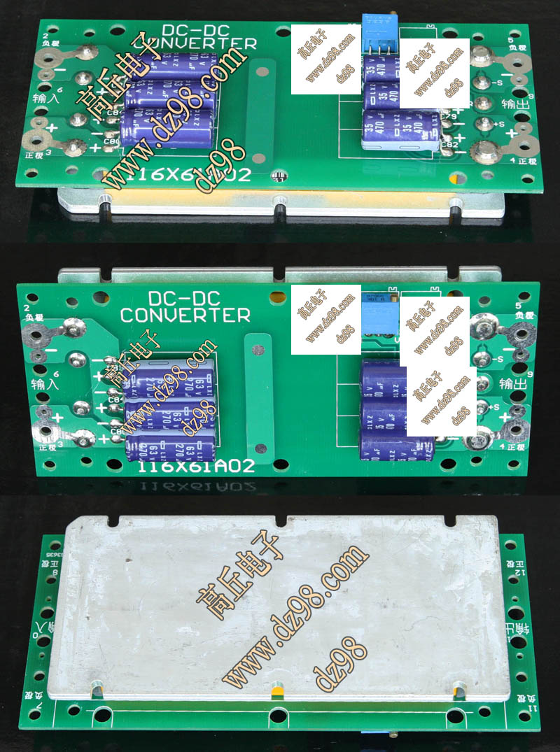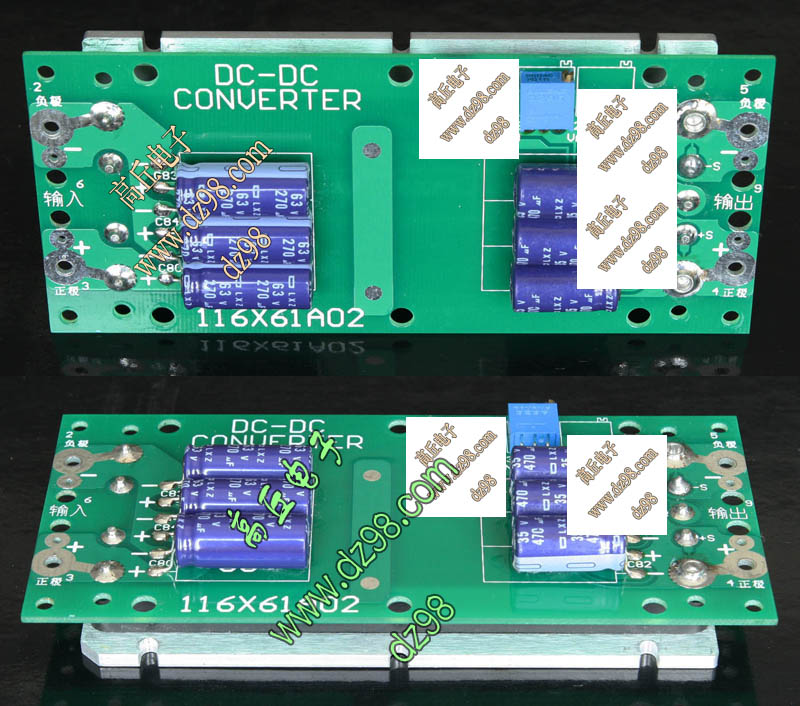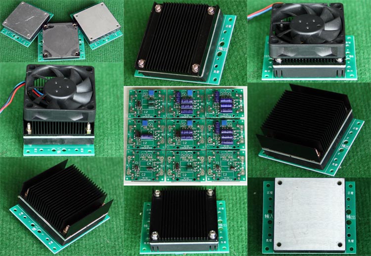 已组装为成品的模块电源,包含必须的输入和输出电容(元件根据不同批次变更),装配调压电位器,对应输出电压从0V-60V可调。输入电压高于19V启动,高于20V满载输出,简单接线:输入2线接直流电源(正负极性不可接反),输出2线接负载。 | 单价500元。 带散热器和风扇530元。 |