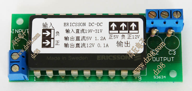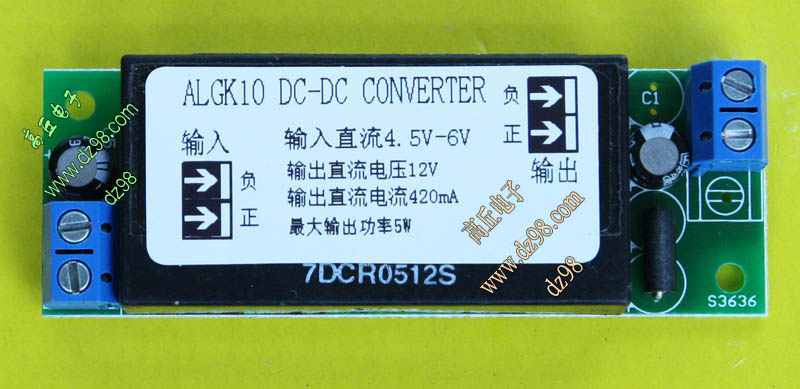 成品的模块电源板,使用方便的接线端子。简单使用:标签已经标明输出和输出接线图样,箭头超内是输入,箭头超外是输出,正负极性不可接反。 | 单价12元。 |