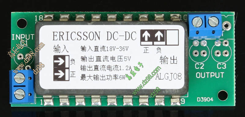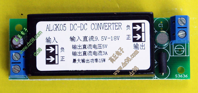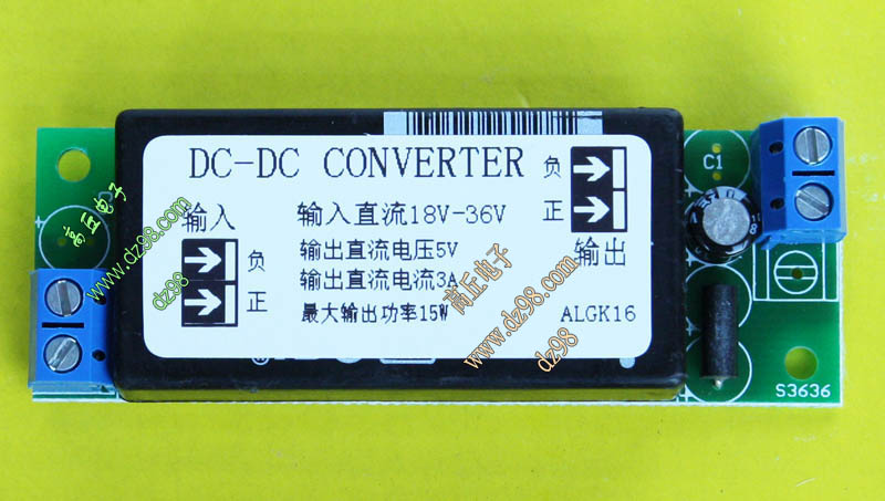 成品的模块电源板,使用方便的接线端子。简单使用:标签已经标明输出和输出接线图样,箭头超内是输入,箭头超外是输出,正负极性不可接反。 | 单价18元。 |