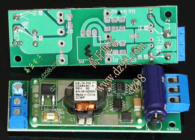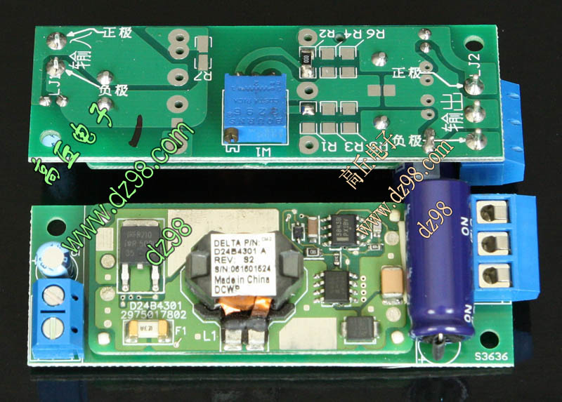 成品的模块电源板,使用方便的接线端子。简单使用:标签已经标明输出和输出接线图样,箭头超内是输入,箭头超外是输出,正负极性不可接反。 | 单价25元。 |