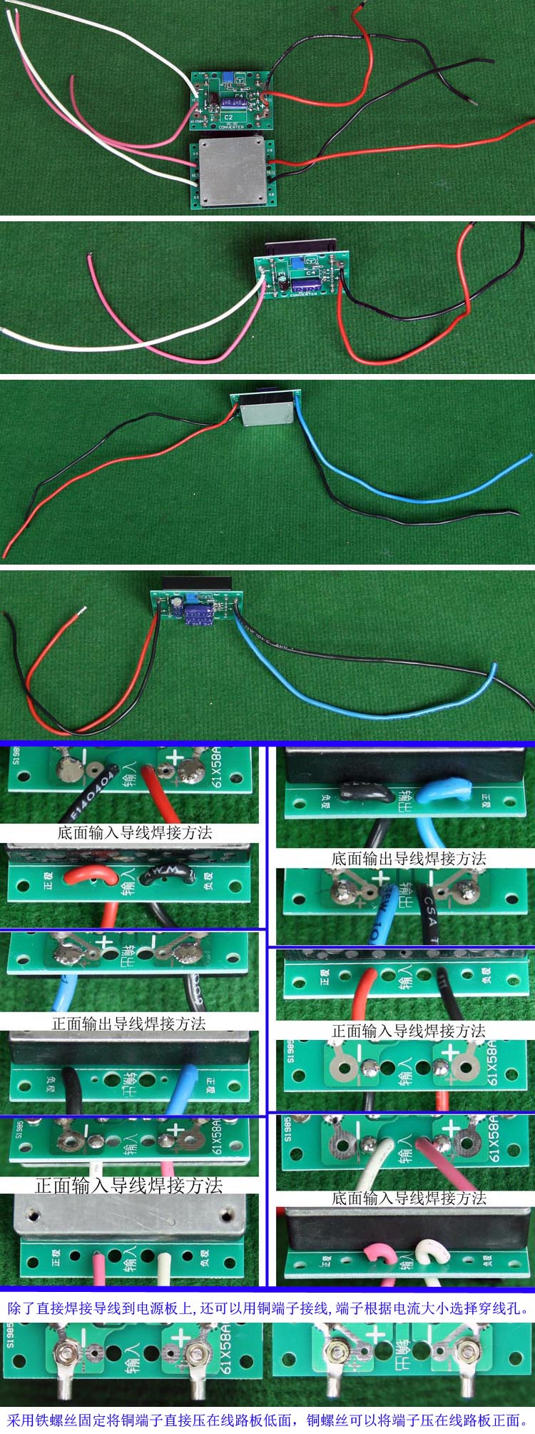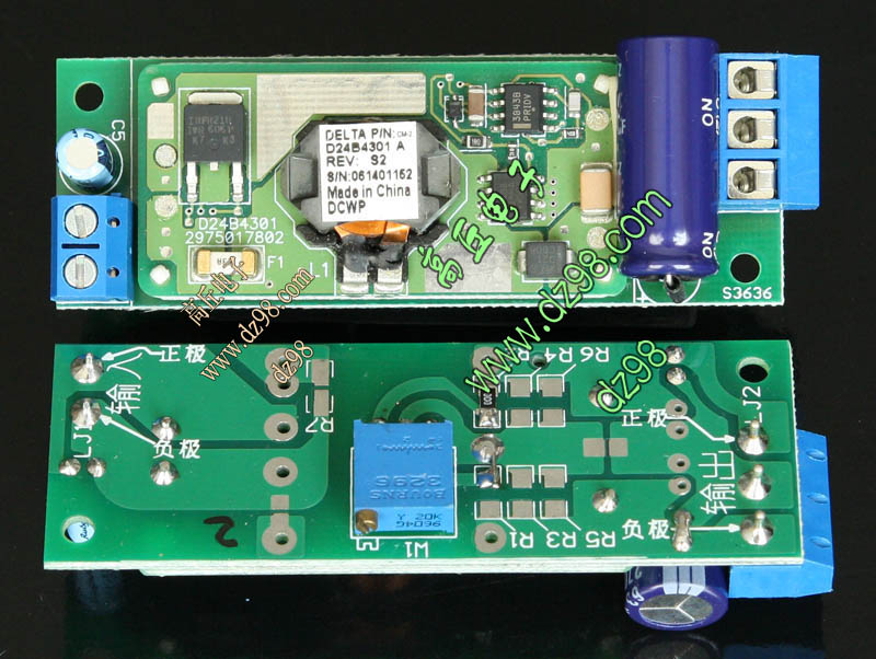成品的模块电源板,使用方便的接线端子。简单使用:标签已经标明输出和输出接线图样,箭头超内是输入,箭头超外是输出,正负极性不可接反。 | 单价10元。 |