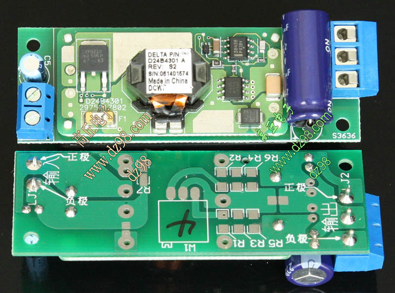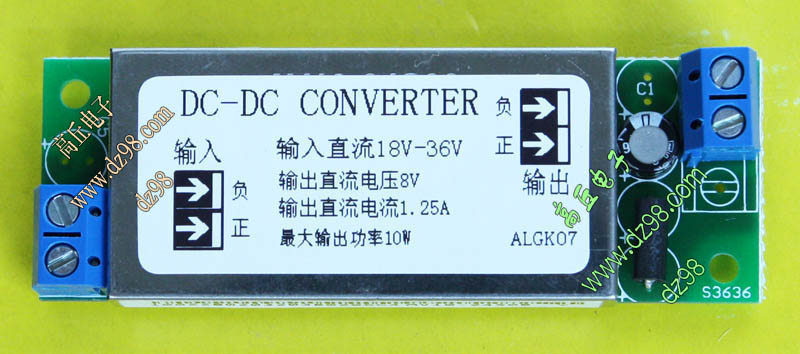成品的模块电源板,使用方便的接线端子。简单使用:标签已经标明输出和输出接线图样,箭头超内是输入,箭头超外是输出,正负极性不可接反。 | 单价32元。 |
