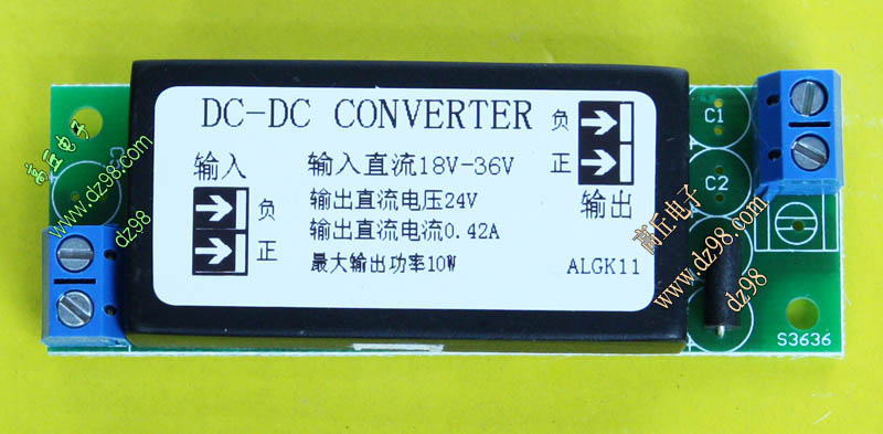 成品的模块电源板,使用方便的接线端子。简单使用:标签已经标明输出和输出接线图样,箭头超内是输入,箭头超外是输出,正负极性不可接反。 | 单价35元。 |
