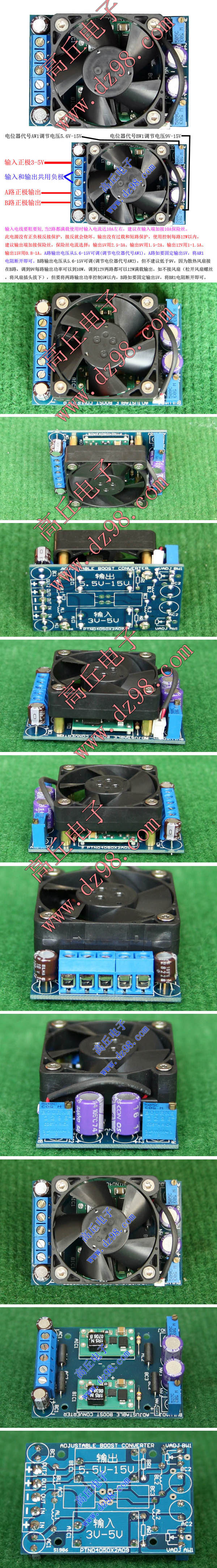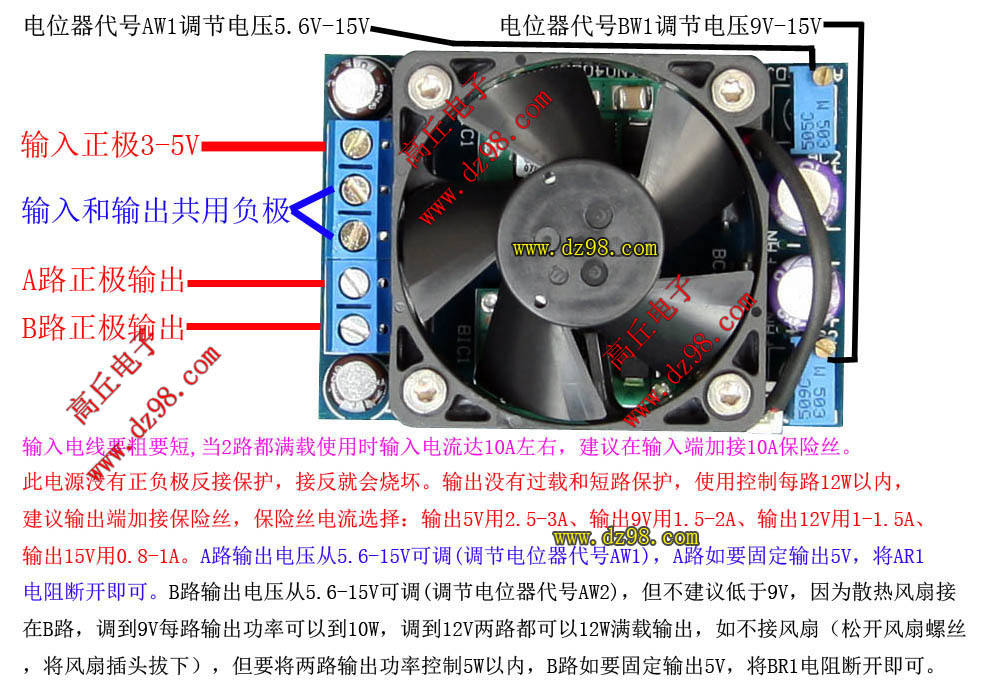 已组装为成品的模块电源,装配2只美国德州电源模块,包含必须的输入和输出电容( 外围元件根据不同批次变更),输入电压3-5V,特别适合3只镍镉电池和镍氢电池串联成3.6V、单节3.6V-3.7V锂电池、3节1.5V干电池等高于3V低于5V电源作为输入源。装有微调电位器, 两路最大功率分别12W可调电压输出,调节电位器对应输出电压从5.6V-15V可调,也可以固定输出5V。简单接线: 输入和输出负极为公用(有两个接线端子都一样),1条输入(正极正负极性不可接反),2个输出正极(注意不能并联使用),2路输出电压独立调整,散热风扇的工作电压范围是9V-15V,所以使用将1路接有散热风扇的电压要调到高于9V(9V可以每路最大输出功率10W,12V可以每路输出满载12W),当然如果每路输出小于5W可以不用散热风扇。 | 单价55元。 |