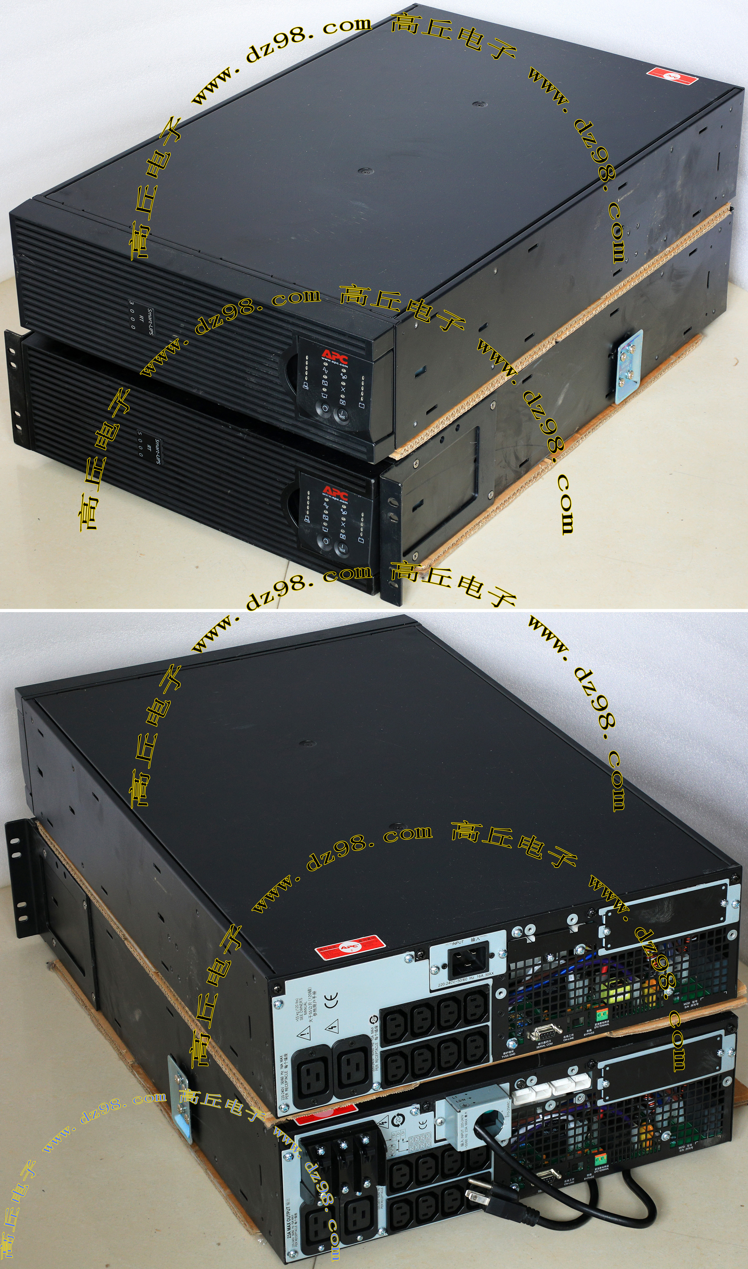 服务器机柜拆下,品牌;APC,外观比较好,内部不带蓄电池。 RT3000外形尺寸;宽433毫米,高133毫米,深710毫米,重量约53公斤。 RT5000外形尺寸;宽483毫米,高133毫米,深710毫米,重量约54公斤。