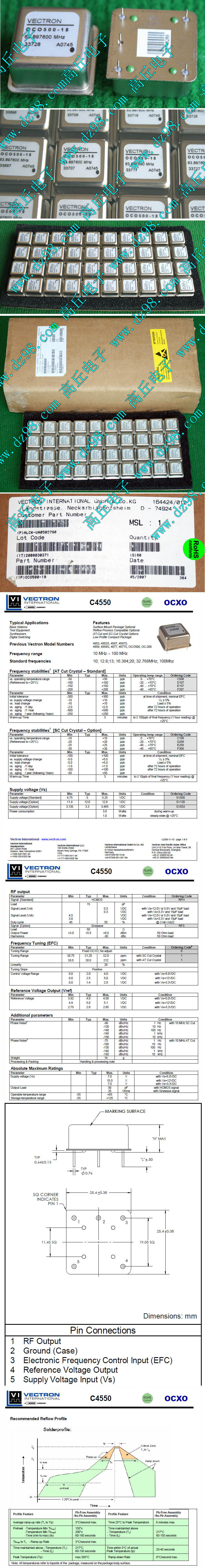 | CORNING MC837X4-016W 5MHz恒温晶体温补晶振荡器AN23 | 全新备件 | 全新备件,包装在粉红色防震泡沫塑料盒内,每盒4只。输入电源电压直流12V(接线图上5V是标错了),输出频率5.000000MHz。使用很方便(共只接3条线),只需接上电源就有输出 。 | 单价60元。 |