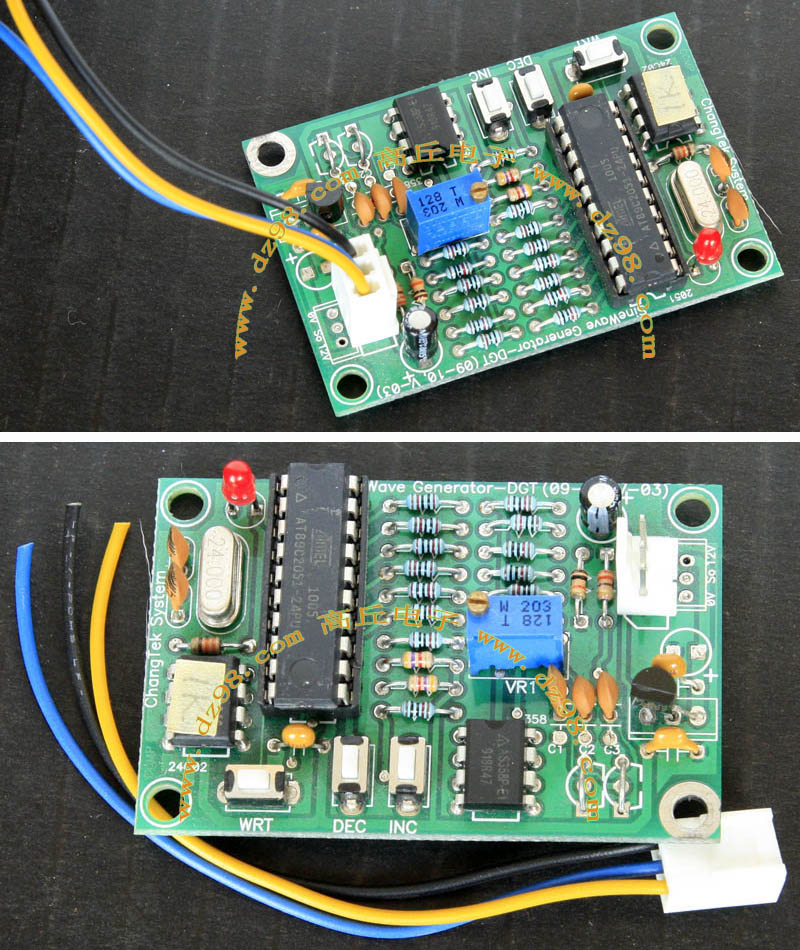 | 400Hz-2000Hz正弦波音频信号发生板AN97 | 拆机件 | 拆机件,实物看图,黄线输入电压直流12V,黑线负极,中间线信号输出,输出频率400Hz到2000Hz可调,板上有轻触按键。外形尺寸;60x40x20毫米,重量约18克。 | 单价35元。 |