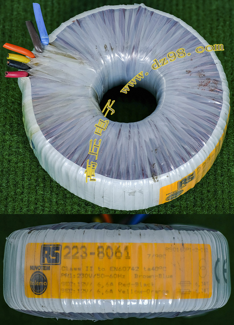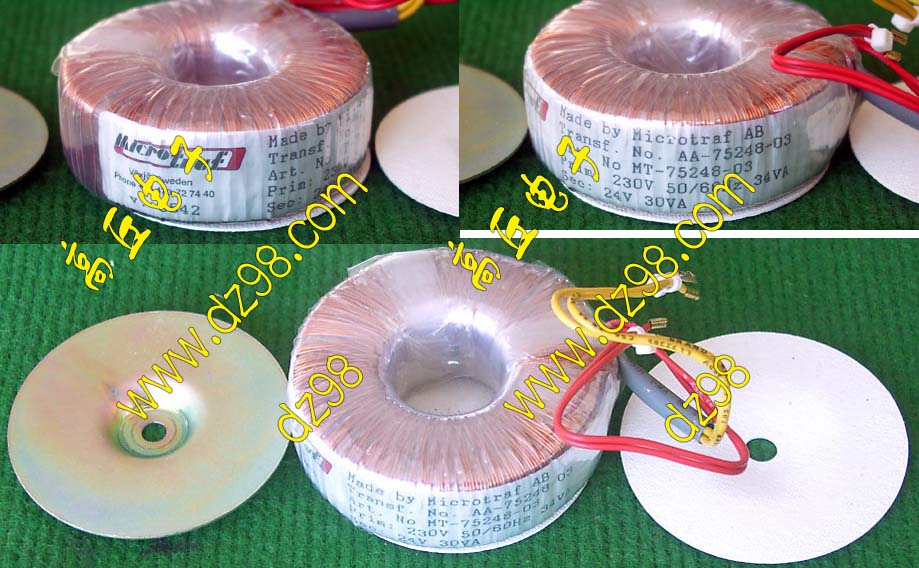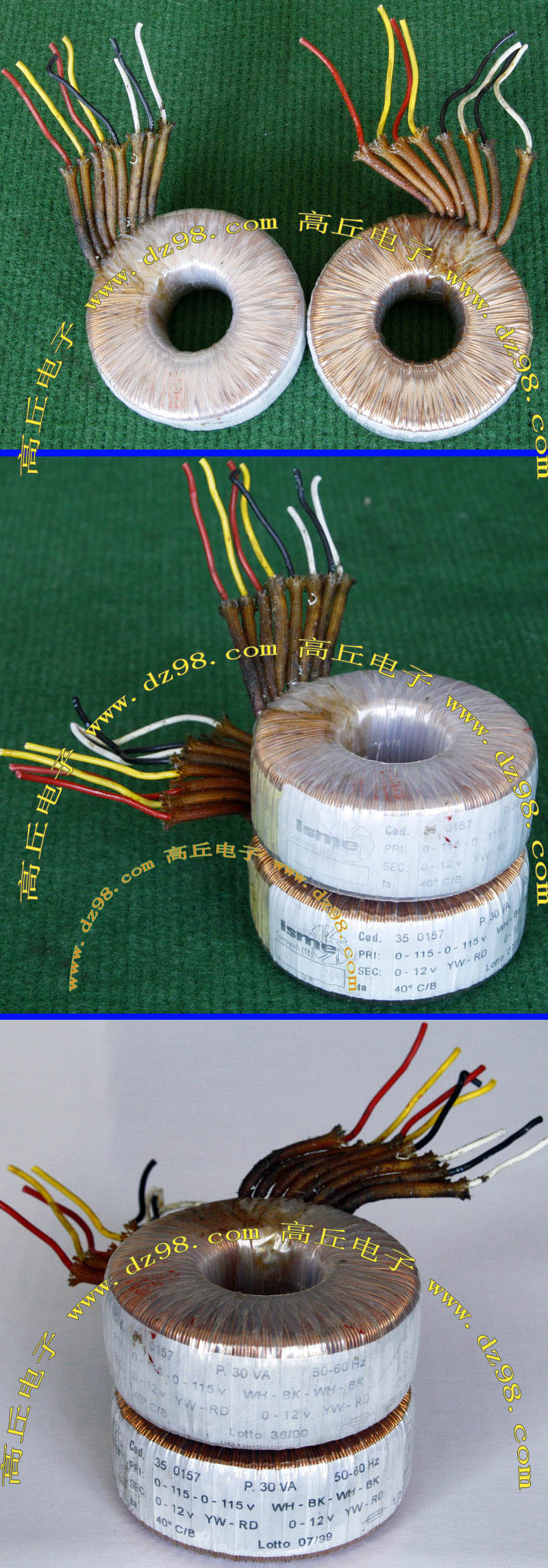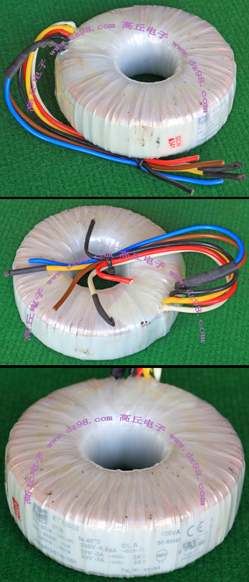 输入2个绕组;0-120V/0-120V,串联即0-240V,输出2个绕组,0-12V/0-12V、功率30VA,外形尺寸:直径70毫米,高度33毫米,重量约455克。