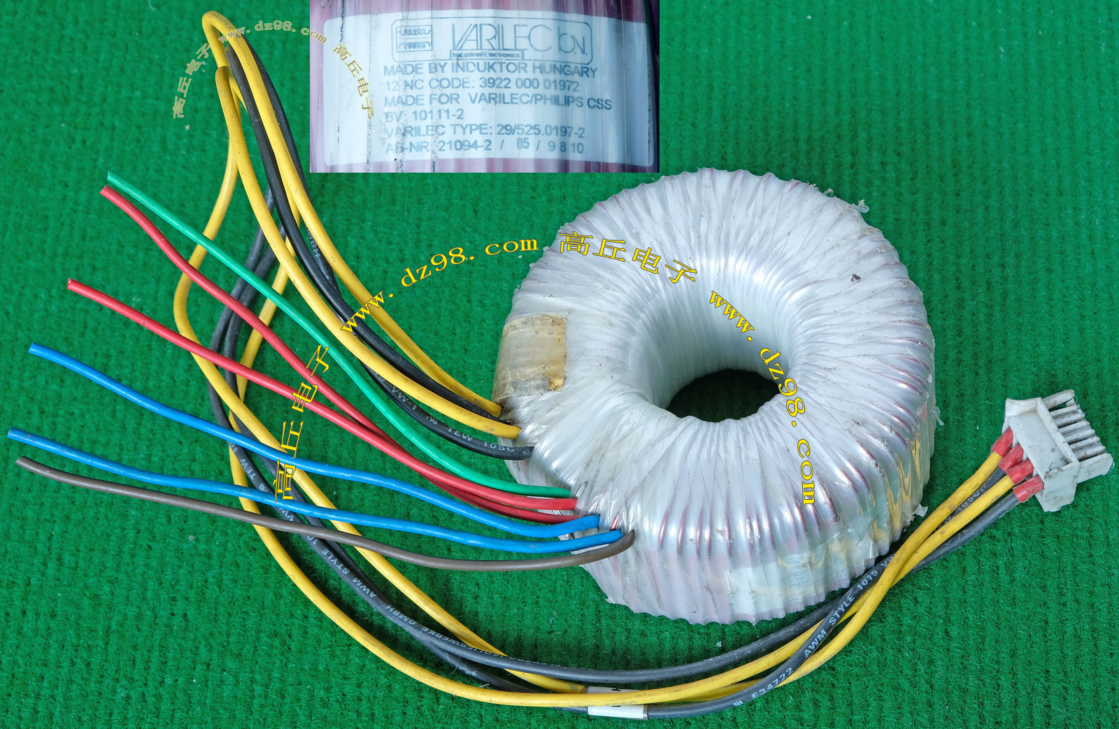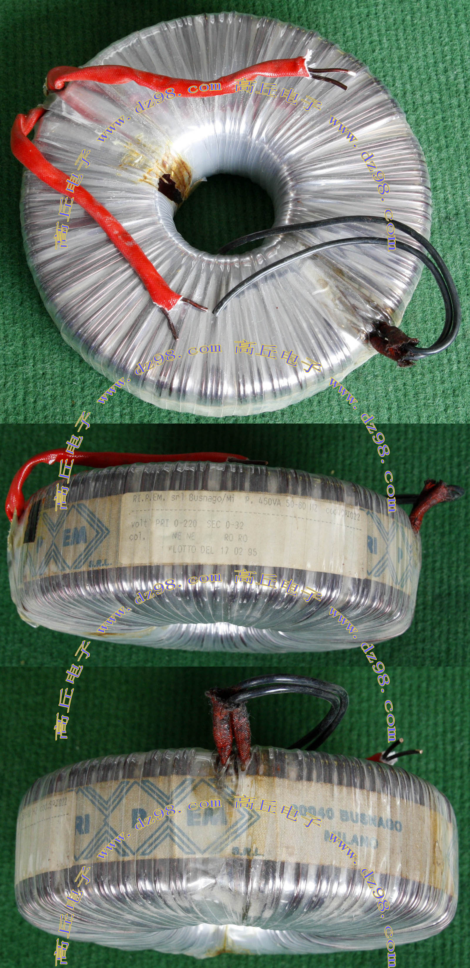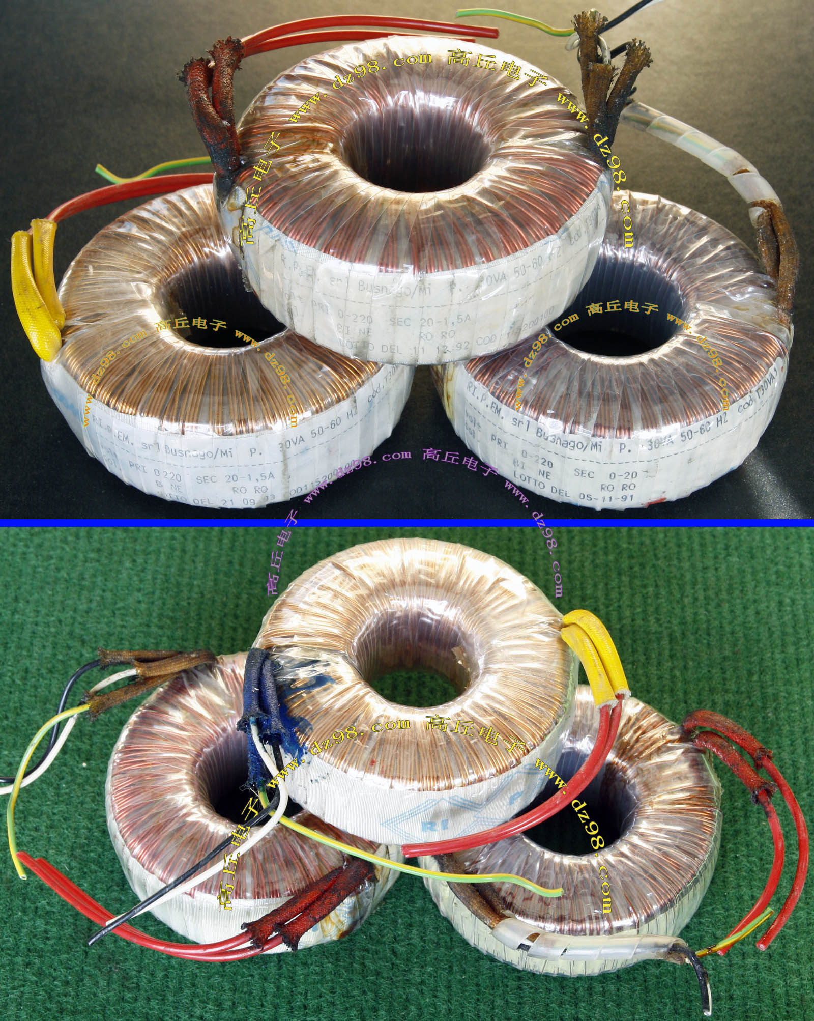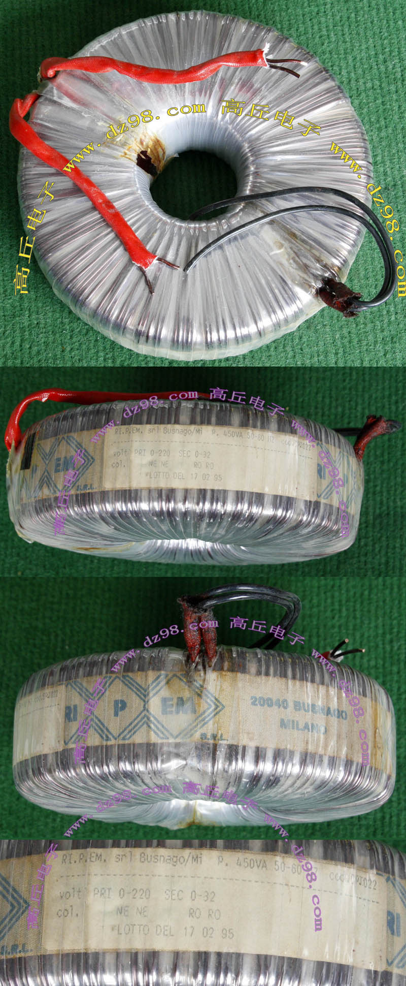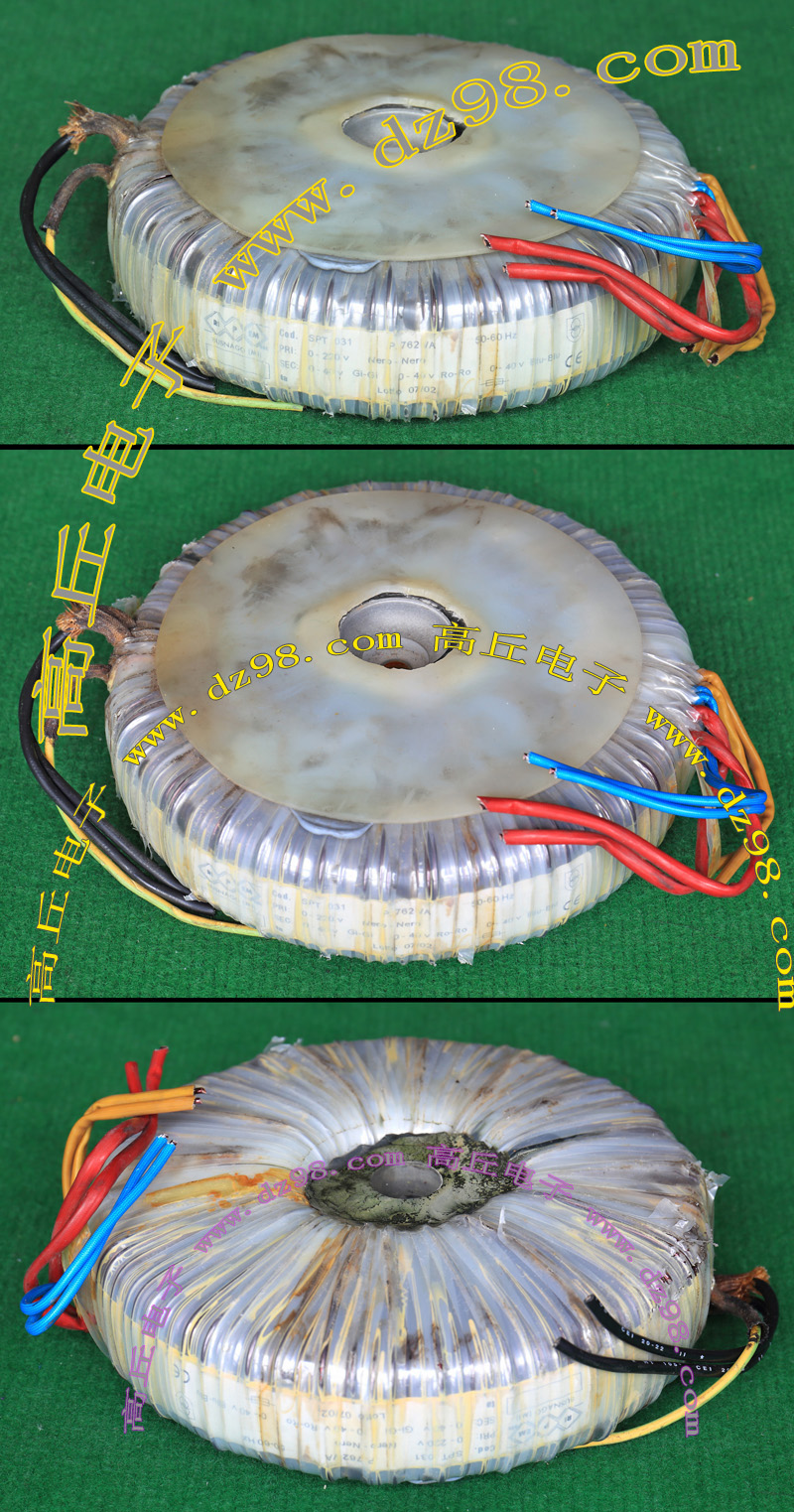 拆机件,外观9成新,输入2组208V绕组,串联起来可当416V输入,输出32V,功率45VA。直径108毫米,厚度28毫米,重量约930克。