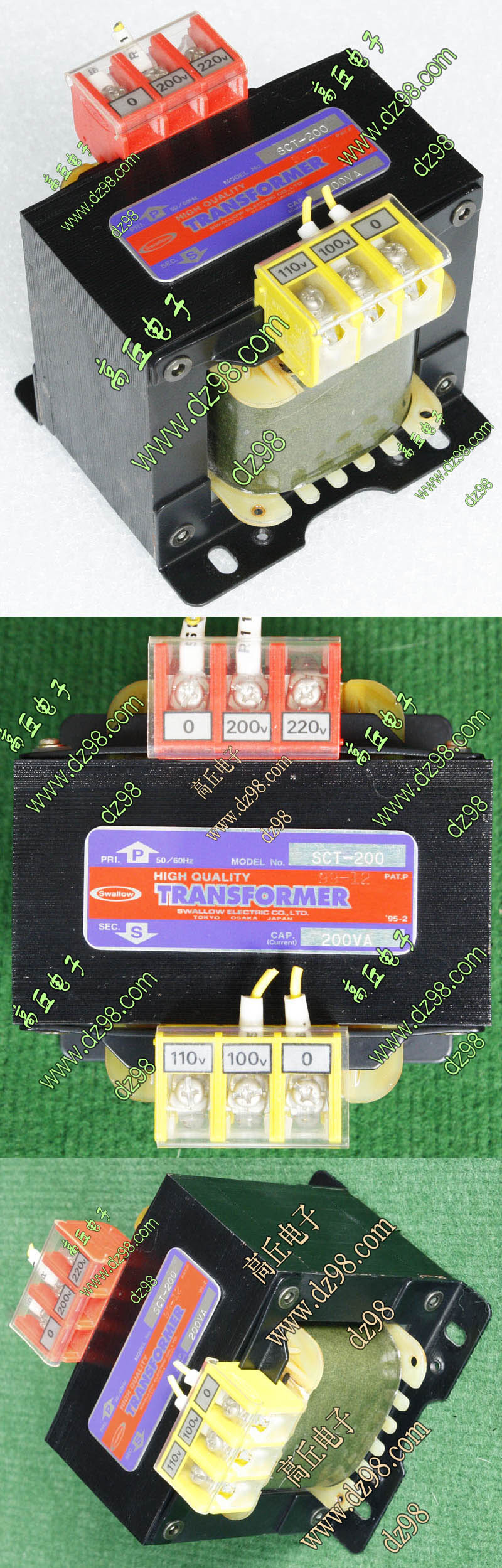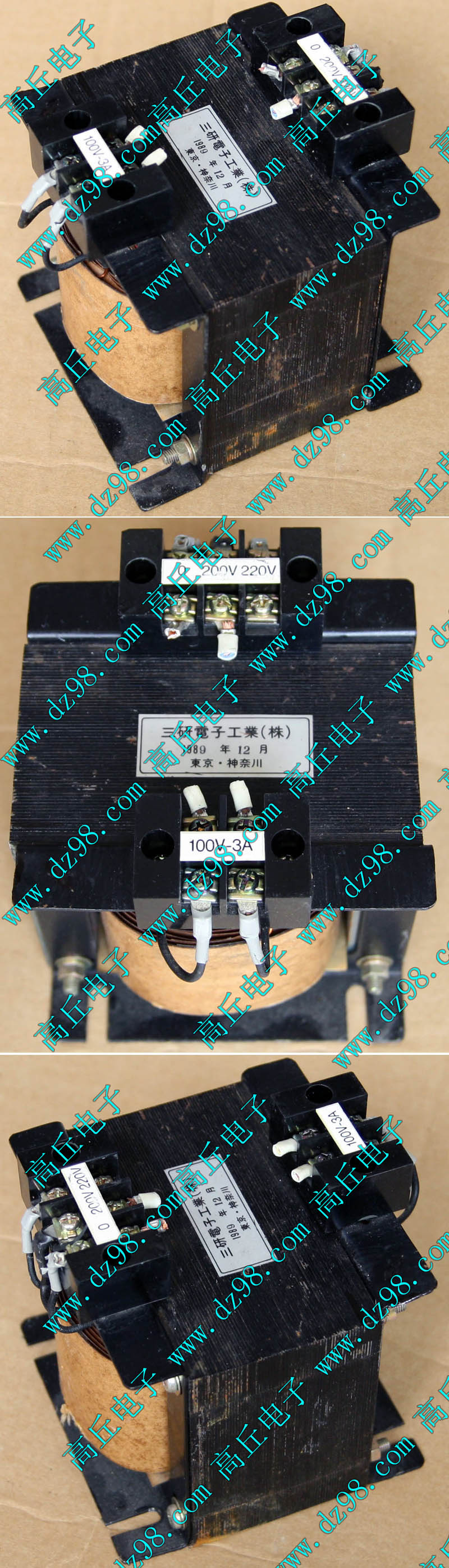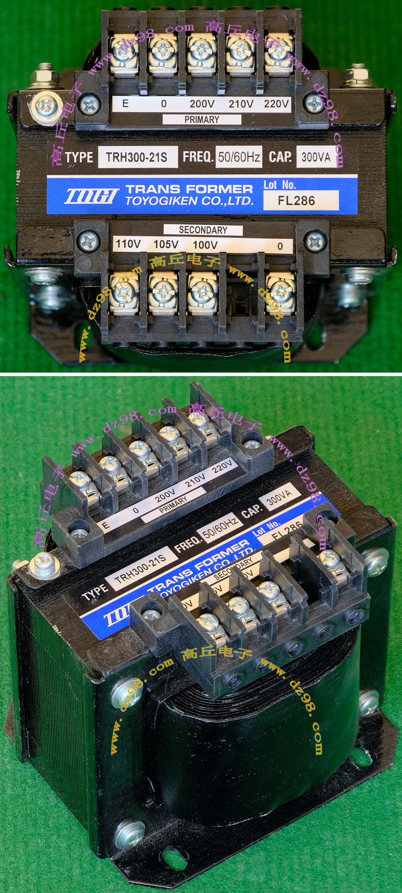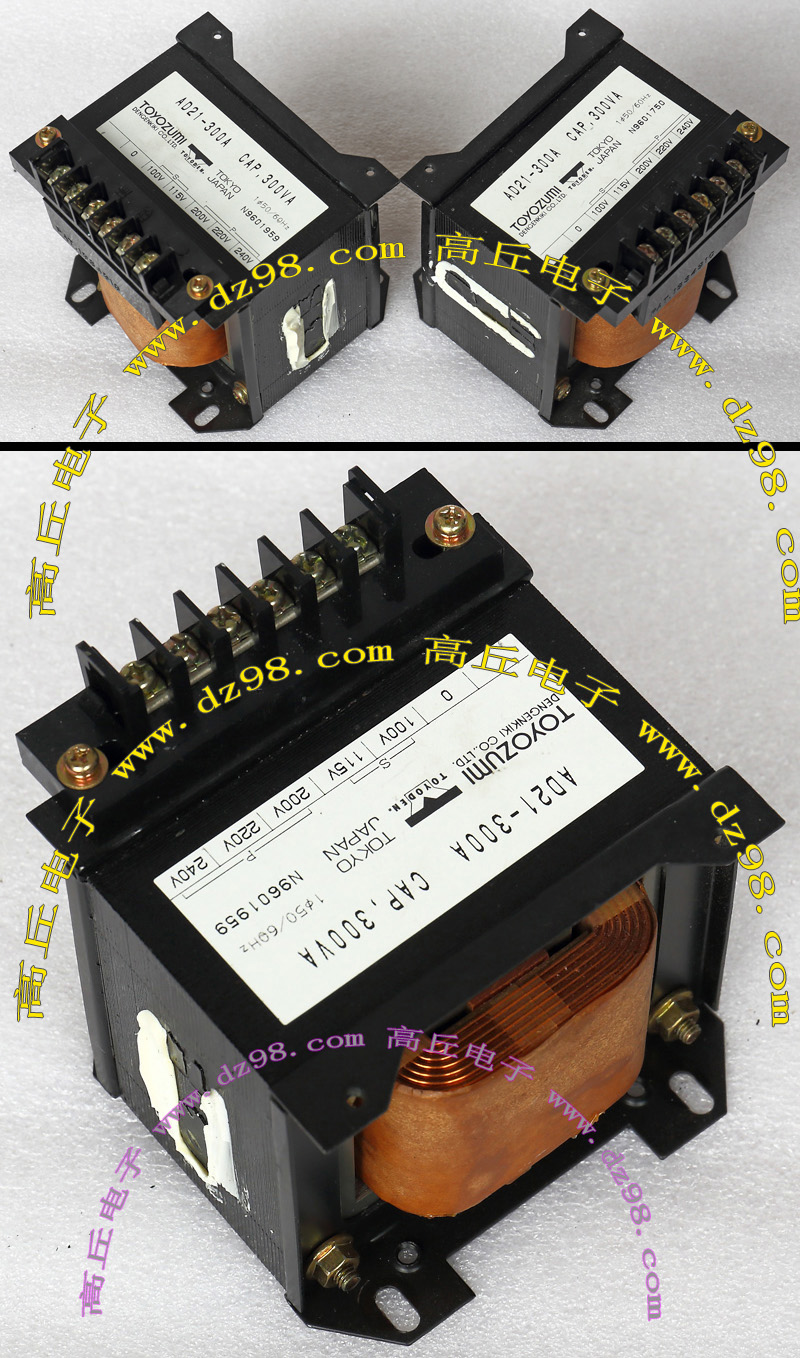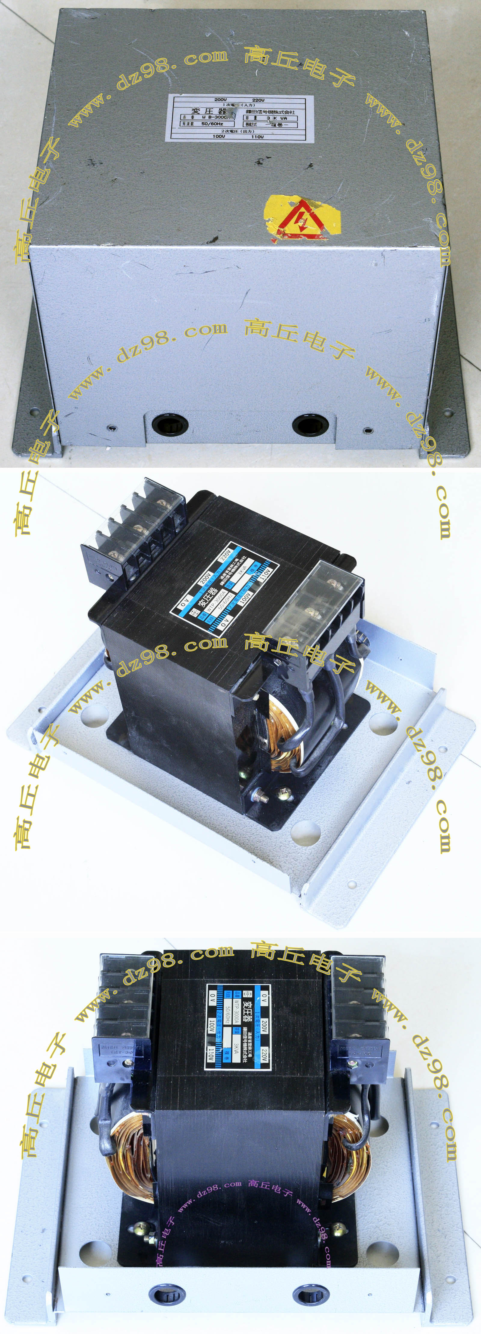 220V(可选择200V、220V或240V),输出AC100V、110V或者115V可选择。 功率300VA。外形尺寸:110x110x高110毫米,矽钢片尺寸:宽105毫米x高88毫米x叠厚61毫米,重量约4.62公斤。型号:SD21-300A,无货。