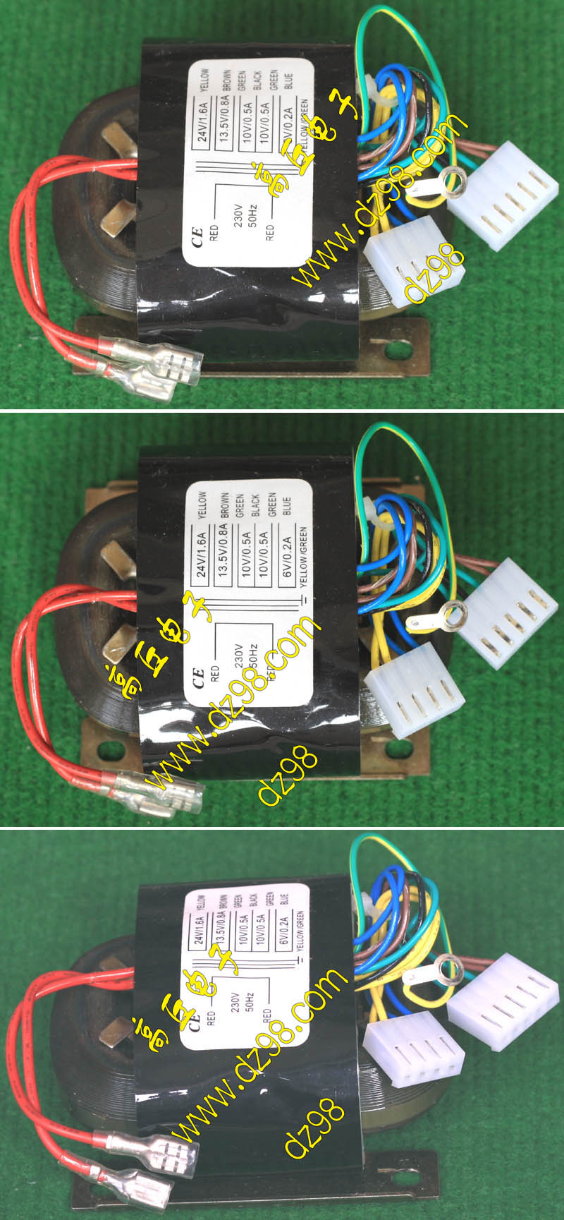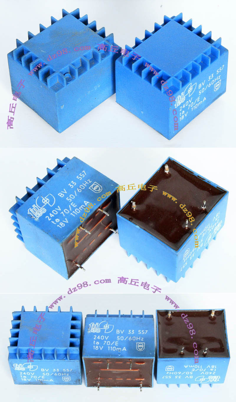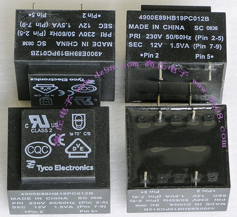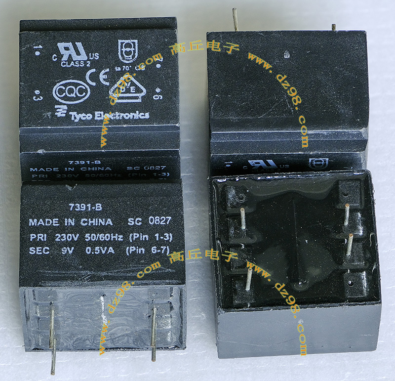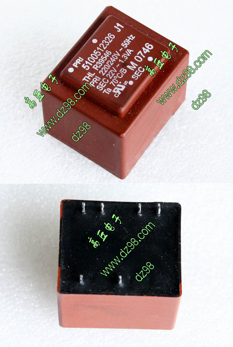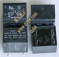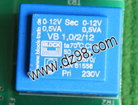 从进口设备拆下,输入AC230V,输出2组独立AC12V,每组功率0.5VA,总功率1VA。外形尺寸:32.5毫米x27.5毫米x高22毫米。