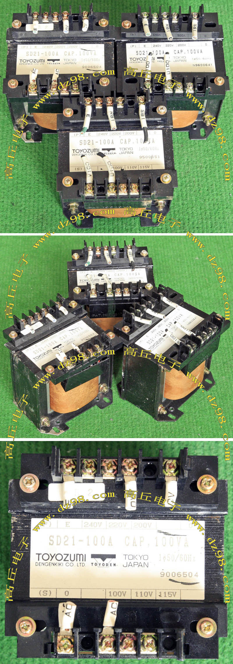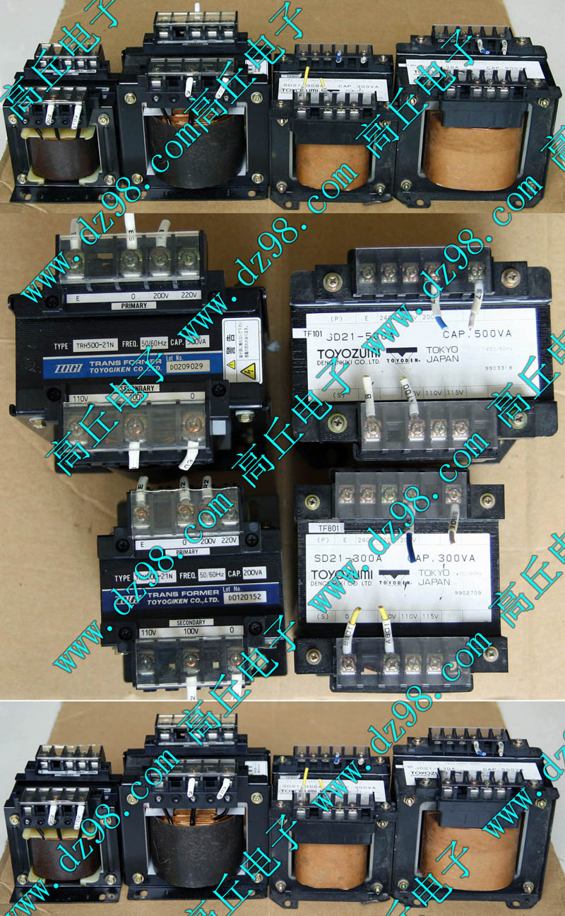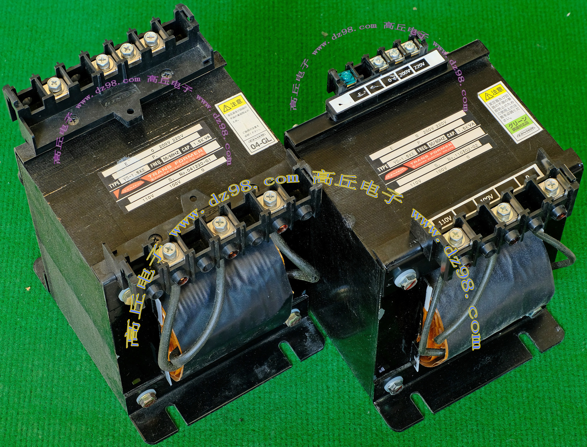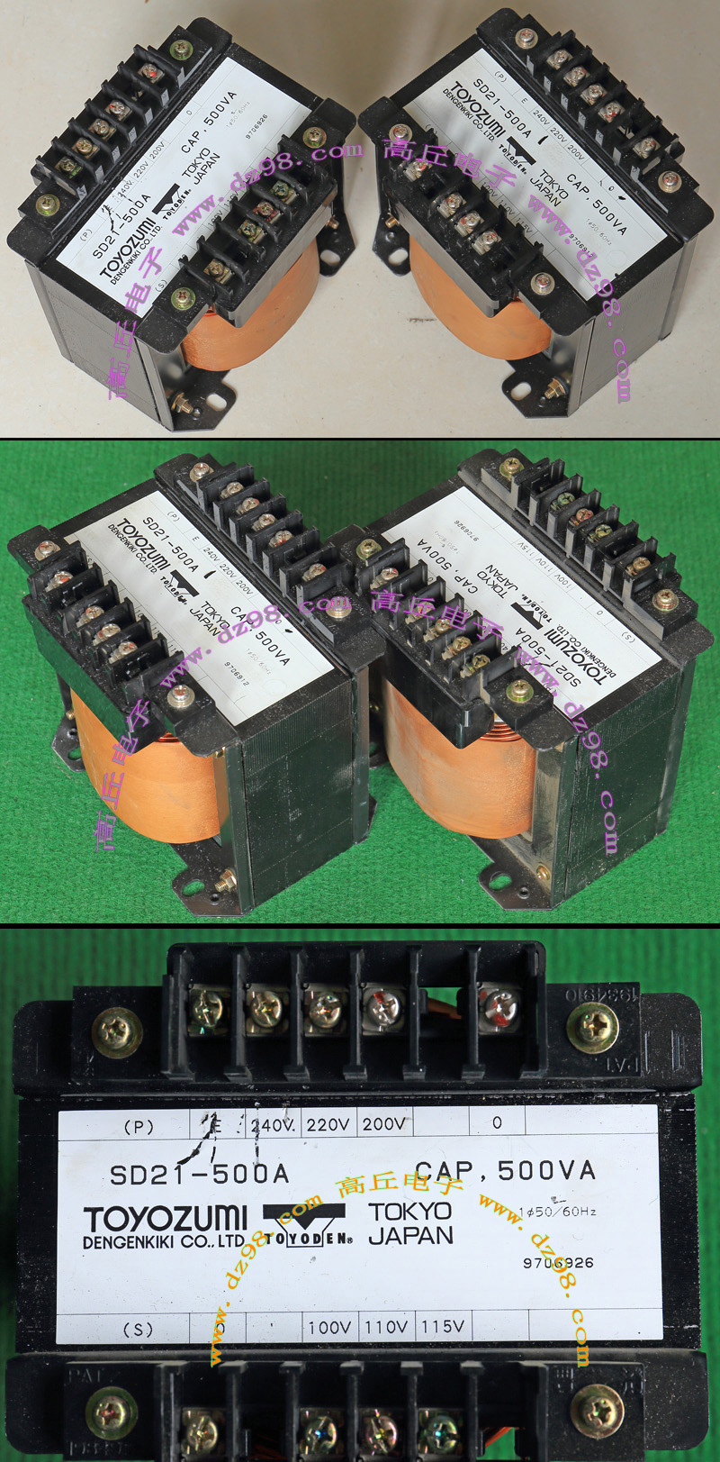 220V(可选择200V、220V或240V),输出AC100V、110V或者115V可选择。 功率500VA。外形尺寸:110x110x高110毫米,矽钢片尺寸:宽135毫米x高95毫米x叠厚50毫米,重量约6.78公斤。型号:SD21-500A,无货。