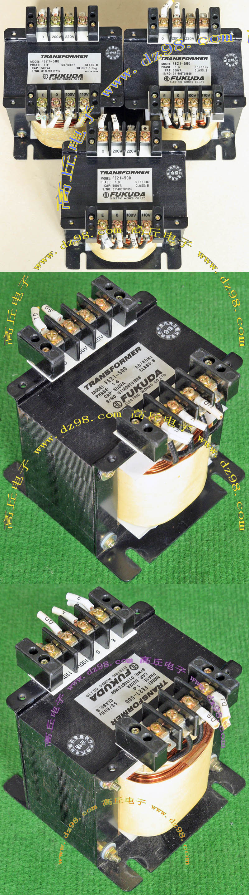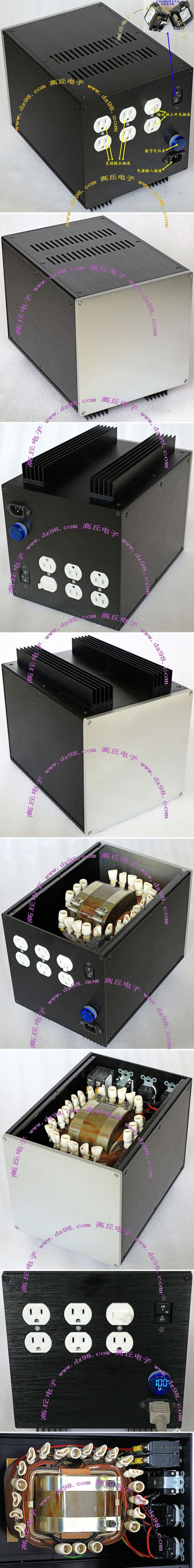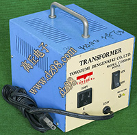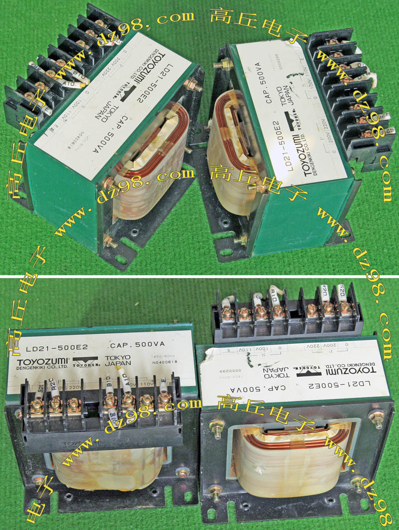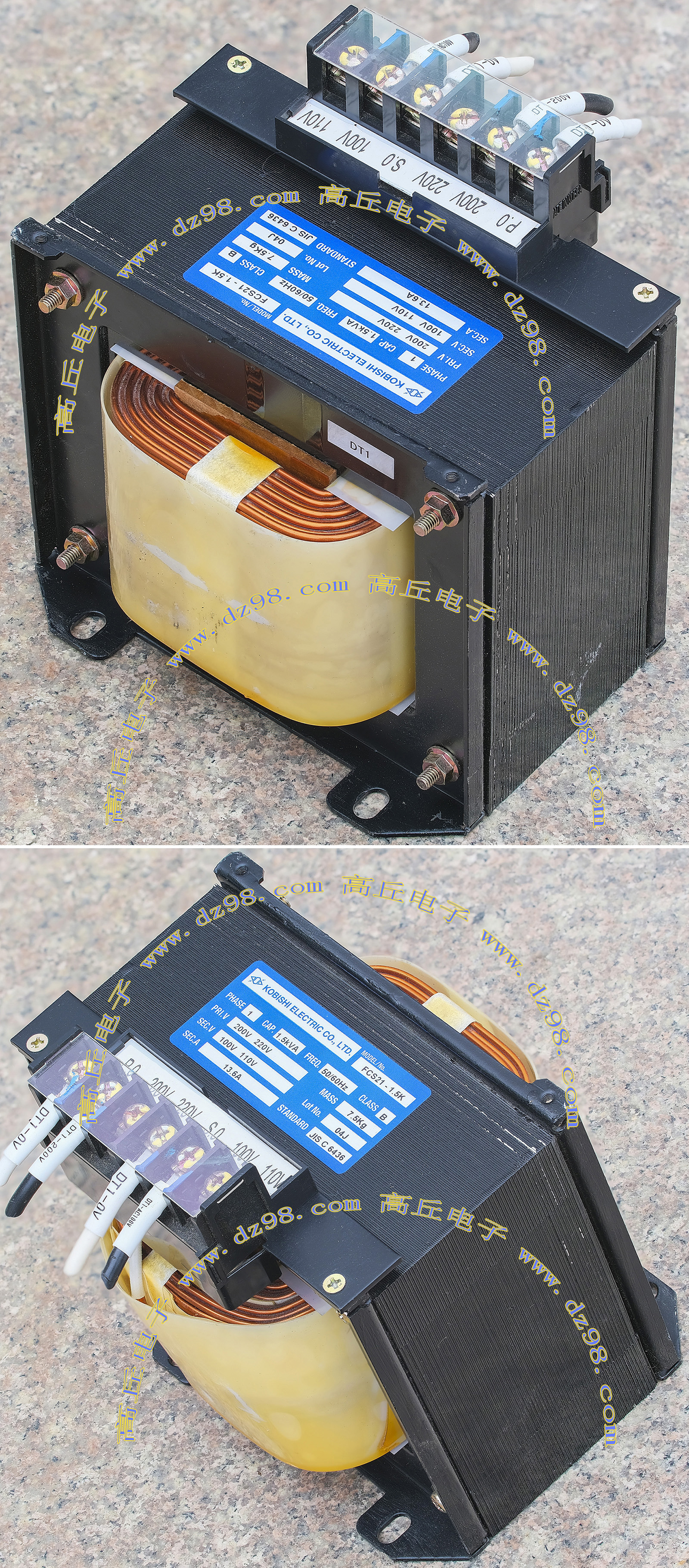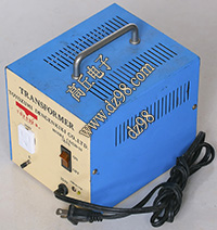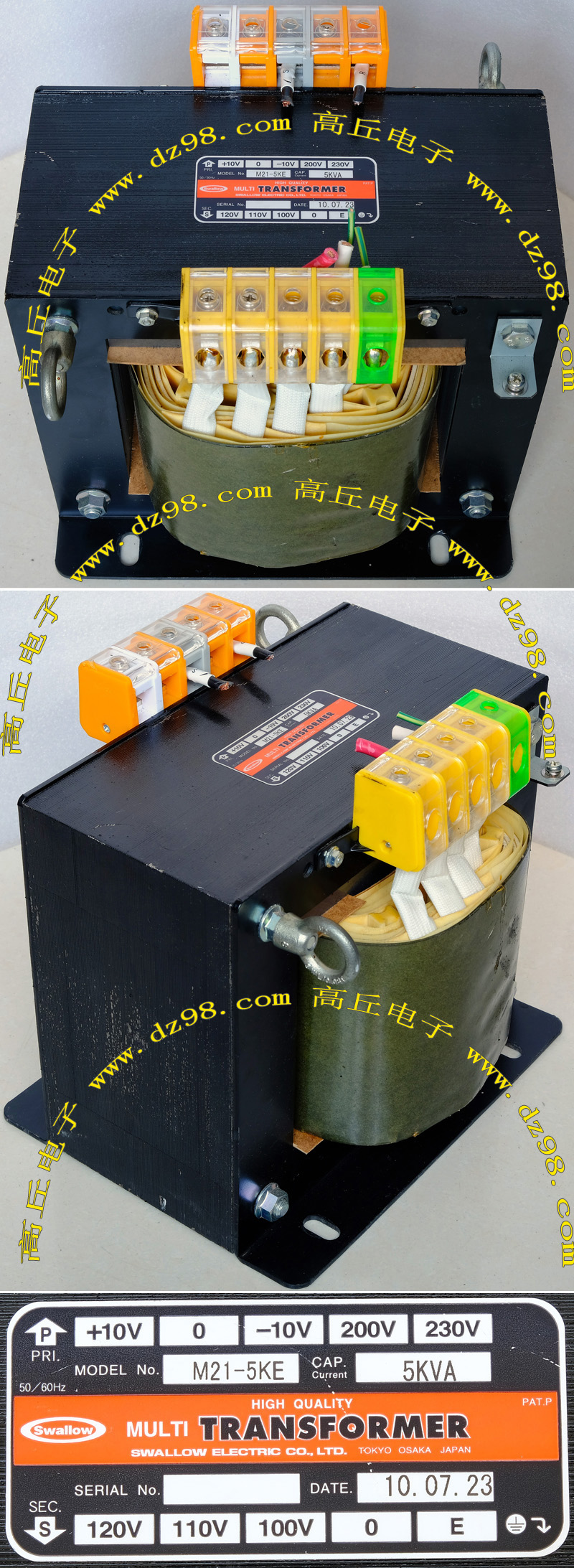220V(可选择200V、220V或240V),输出AC100V、110V或者115V可选择。 功率500VA。外形尺寸:110x110x高110毫米,矽钢片尺寸:宽135毫米x高95毫米x叠厚50毫米,重量约6.78公斤。型号:SD21-500A,无货。