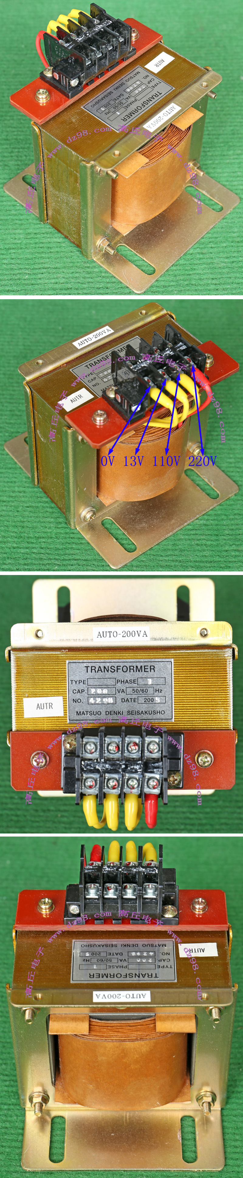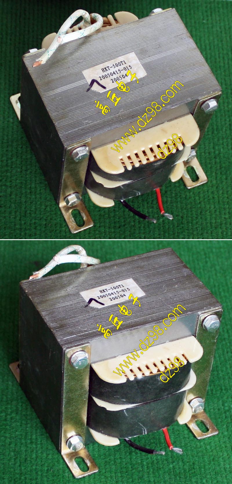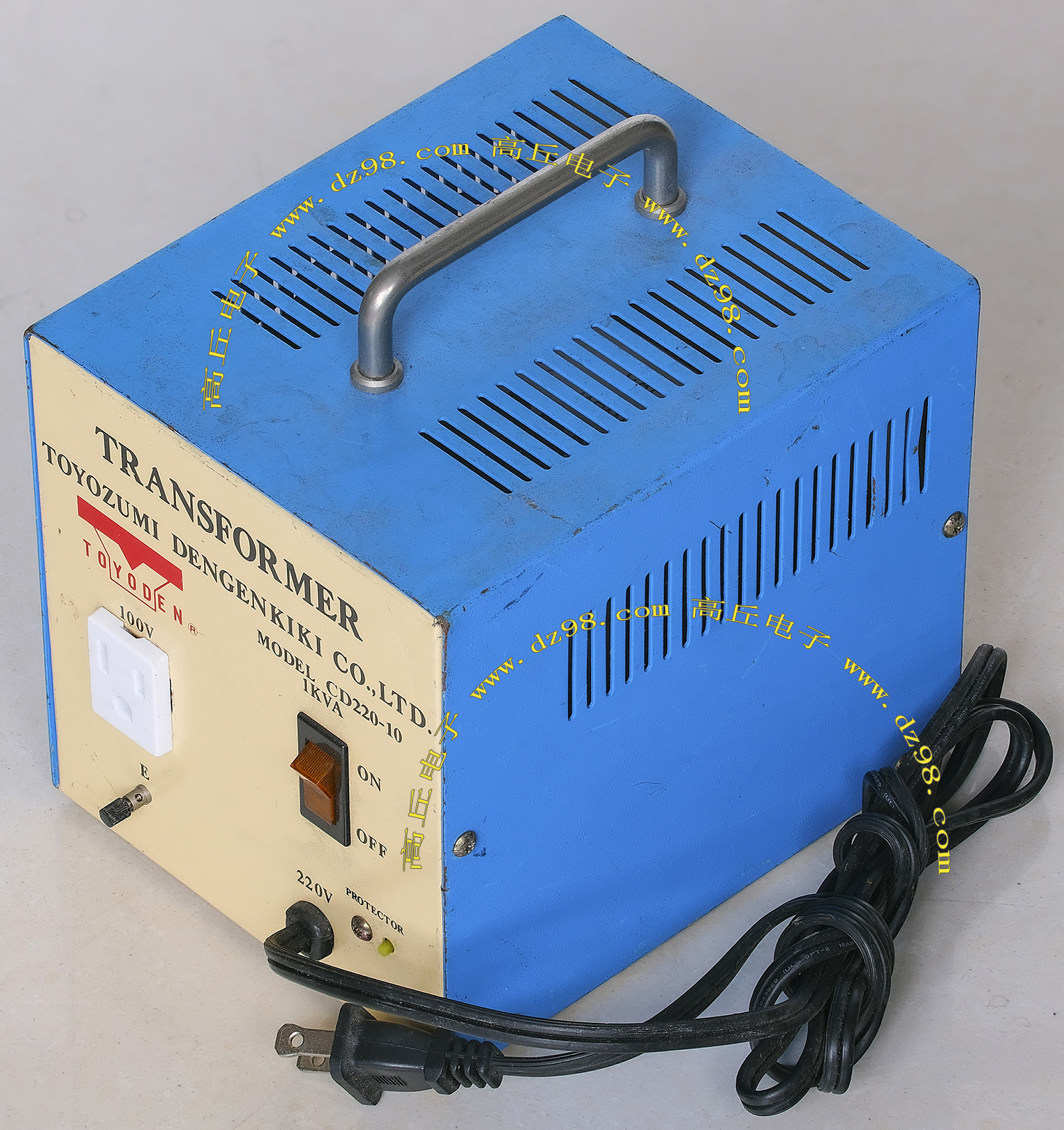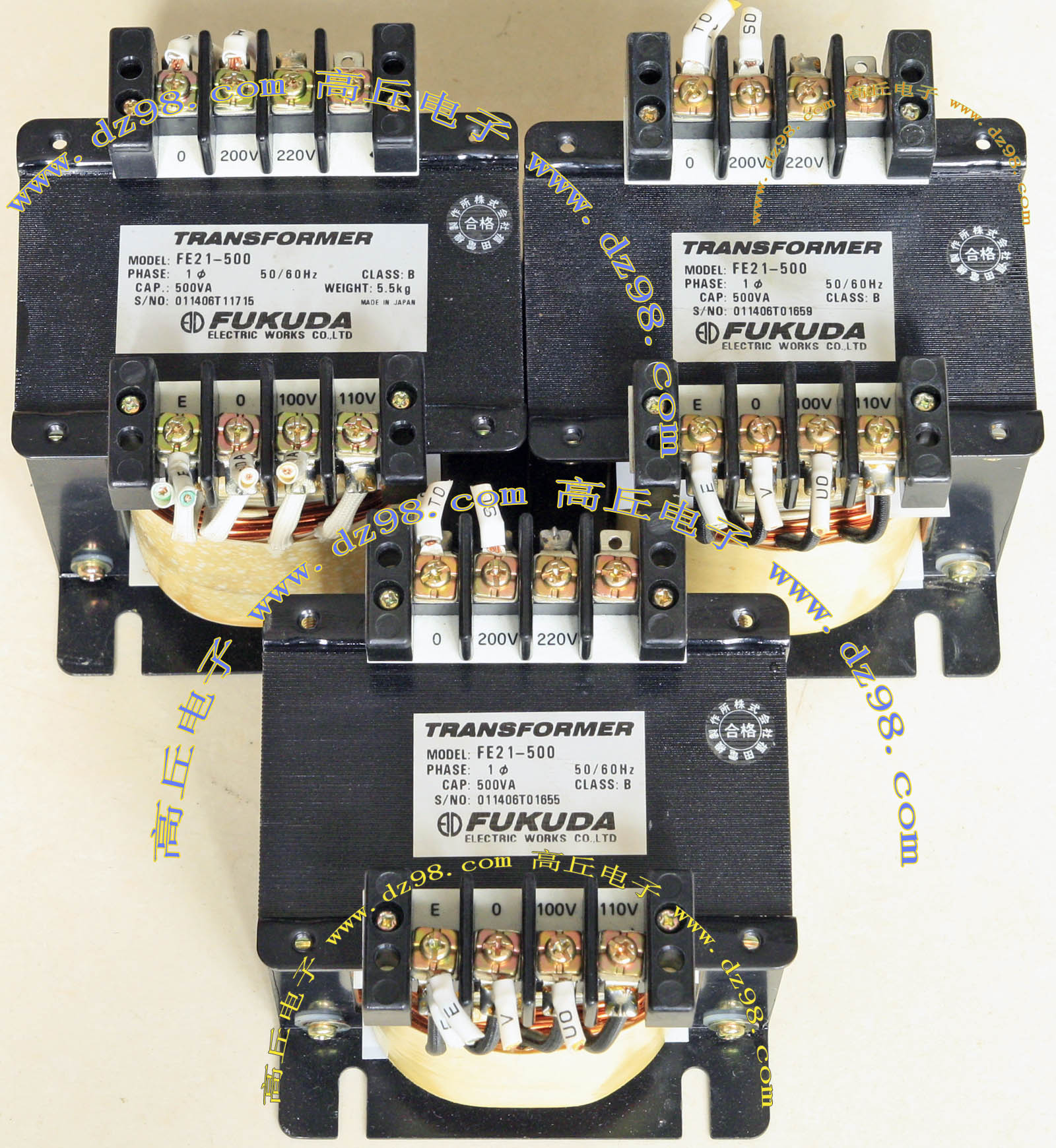 220V(可选择200V、220V或240V),输出AC100V、110V或者115V可选择。 功率500VA。外形尺寸:110x110x高110毫米,矽钢片尺寸:宽135毫米x高95毫米x叠厚50毫米,重量约6.78公斤。型号:SD21-500A,无货。