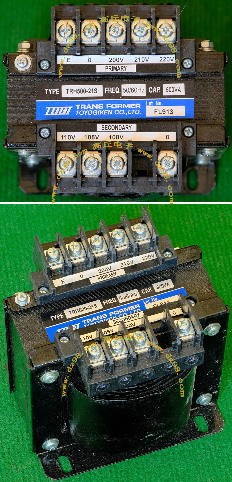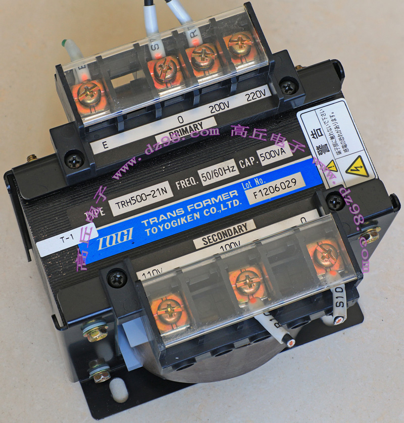 220V(可选择200V或220V),输出AC100V或者110V可选择。 功率500VA。外形尺寸:135x102x高135毫米,矽钢片尺寸:宽128毫米x高104毫米x叠厚61毫米,重量约6.69公斤。型号:TRH500-21N,无货。