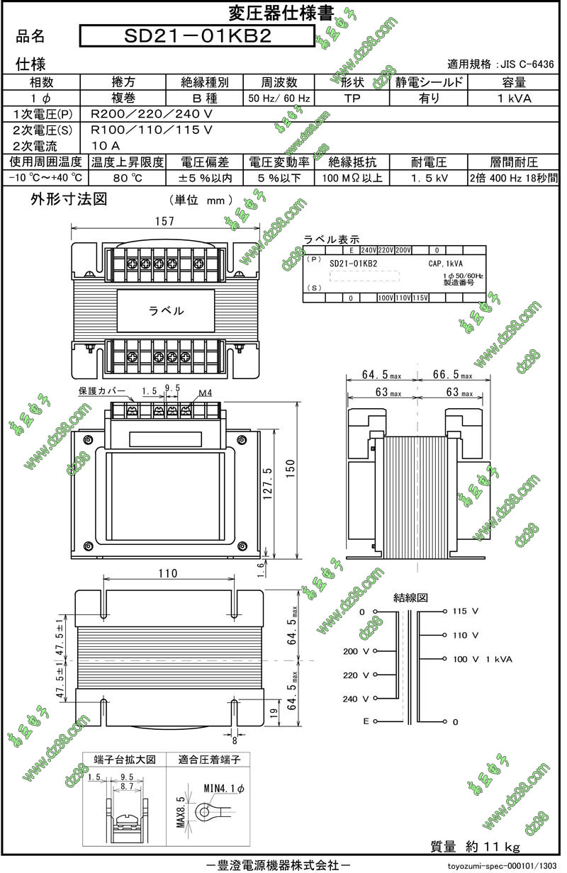 日本TOYOZUMI 丰澄 SD21-500A2 220-240V转100V-110V-115V 500VA隔离电源变压器AQ286