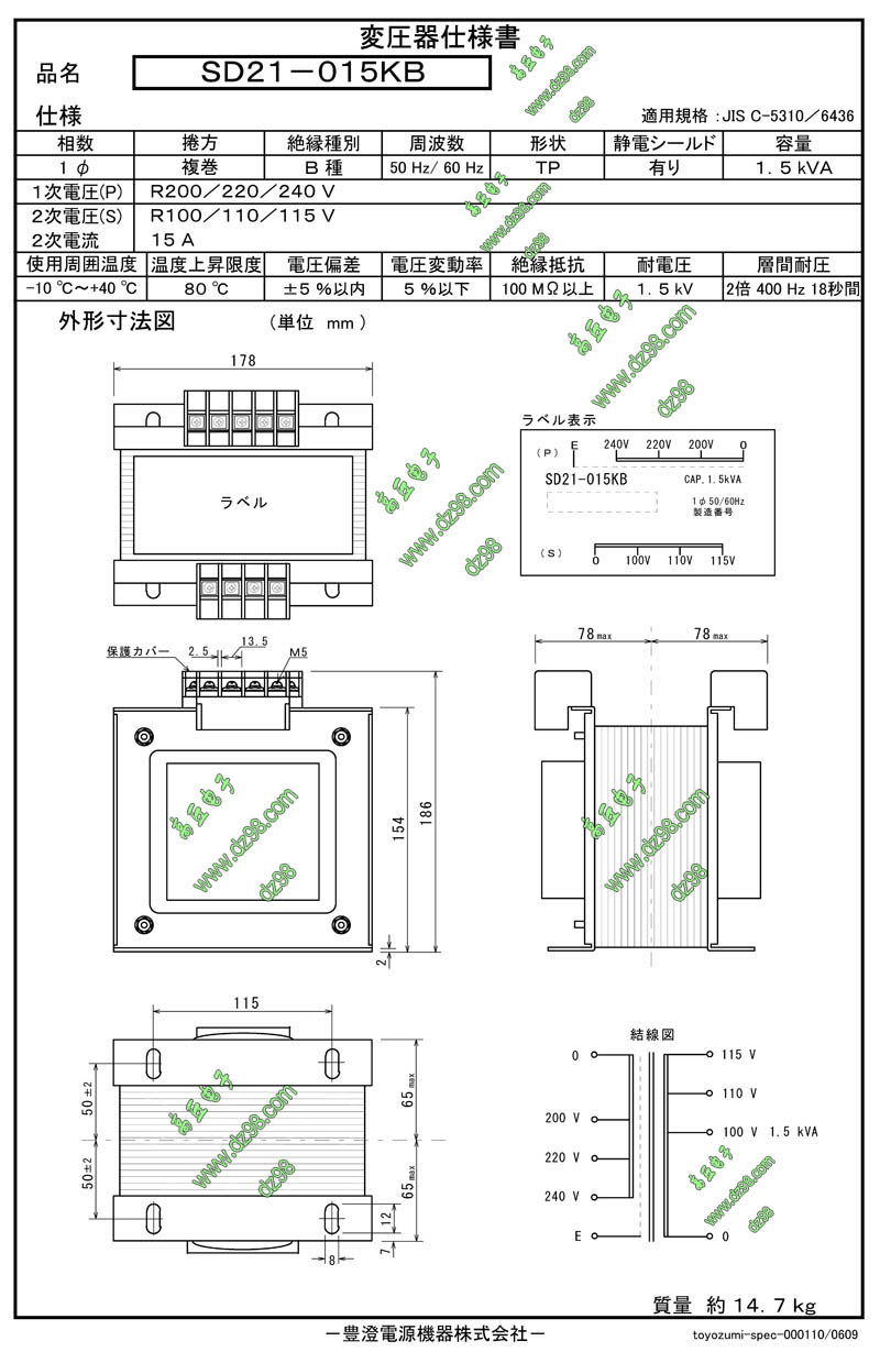 | 日本TOYOZUMI 丰澄SD21-015KB2 200V-220V-240V转100V-110V-115V