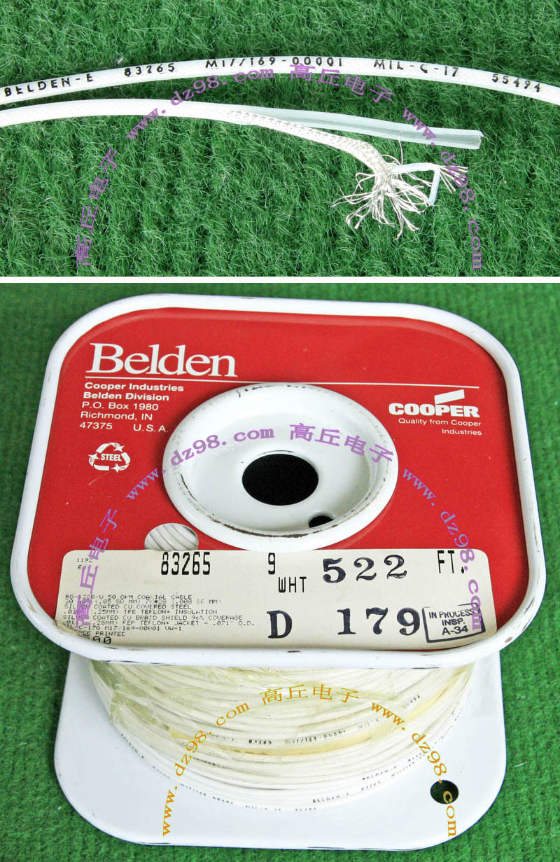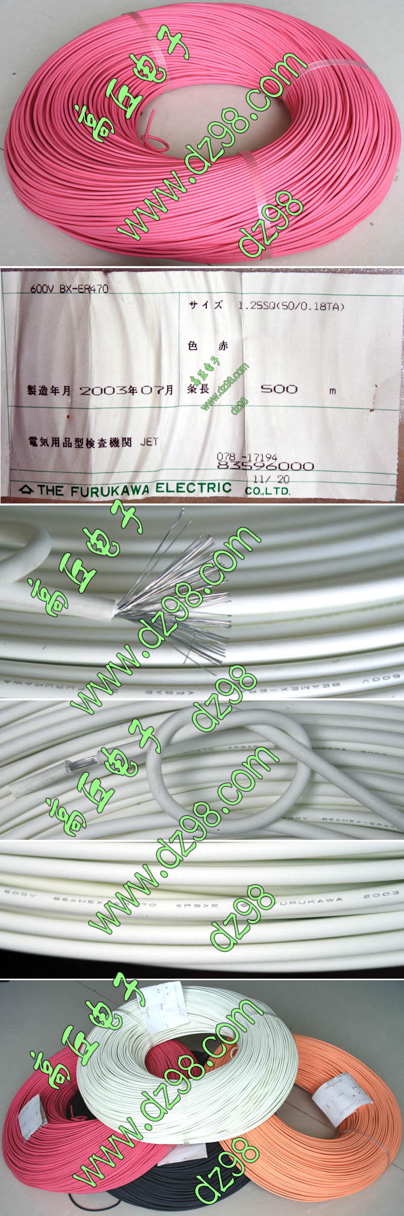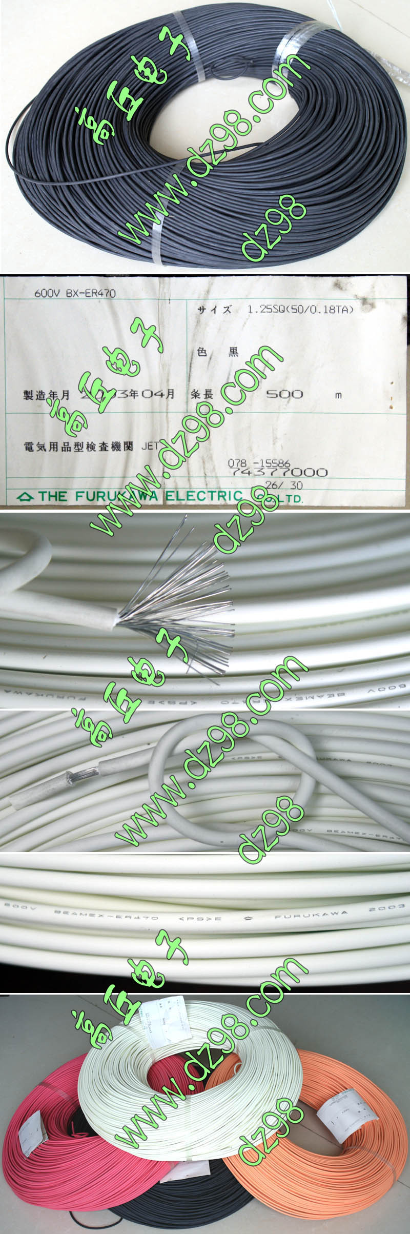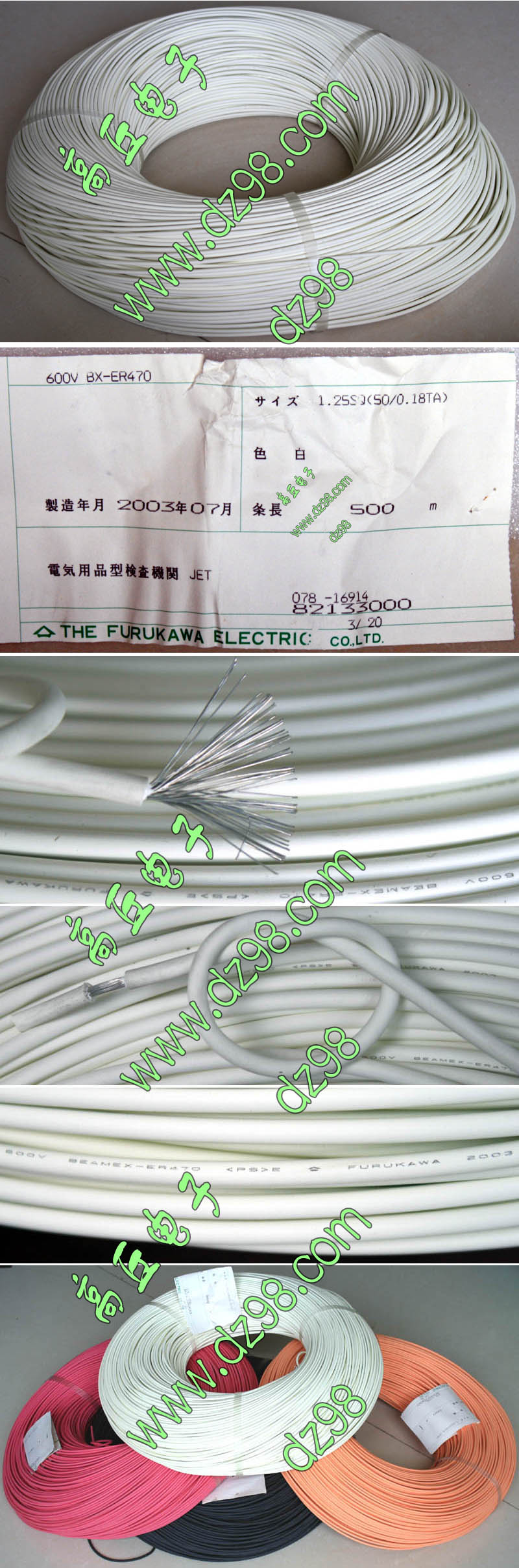 厂牌:日本-古河 FURUKAWA,每卷长度300米,颜色:白色,内部由50条直径0.18mm镀镊铜丝组成,外皮是耐高温的阻燃绝缘材料制,线外直径约3.1mm,线表皮印字:600V BEAMEX-ER470 <PS> E FURUKAWA 2003,很细的文字印得非常精致,广泛用在军工产品,航空设备,冶炼设备,电动机车和汽车电路,家庭的微波炉和空调里也有用到。 | 单价每米3元。 |