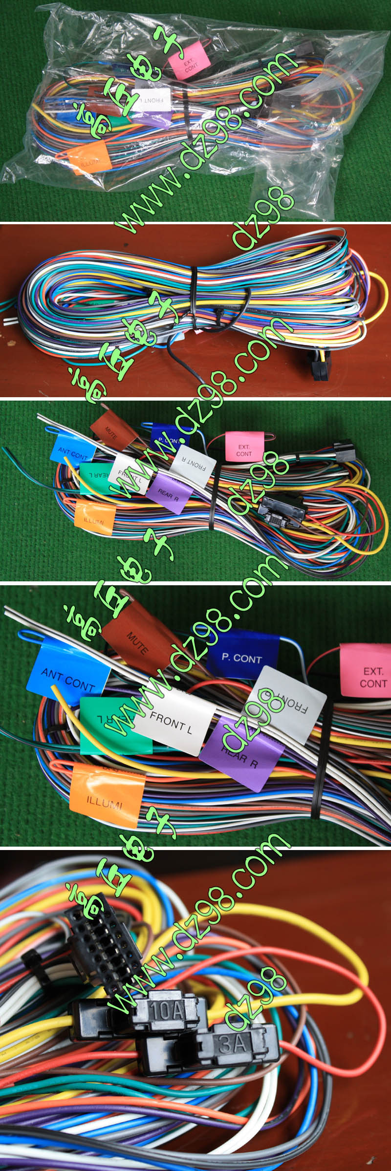 全新品,全长达到6.9米, 共13条导线采用不同色标:12条外直径1.7毫米(内部由25条0.15毫米镀镍铜线组合),其中一条红色带3A保险丝,另1条(粗黄线)是外直径2.35毫米带10A保险丝(内部由25条0.25毫米镀镍铜线组合),线整体重量约670克。 |