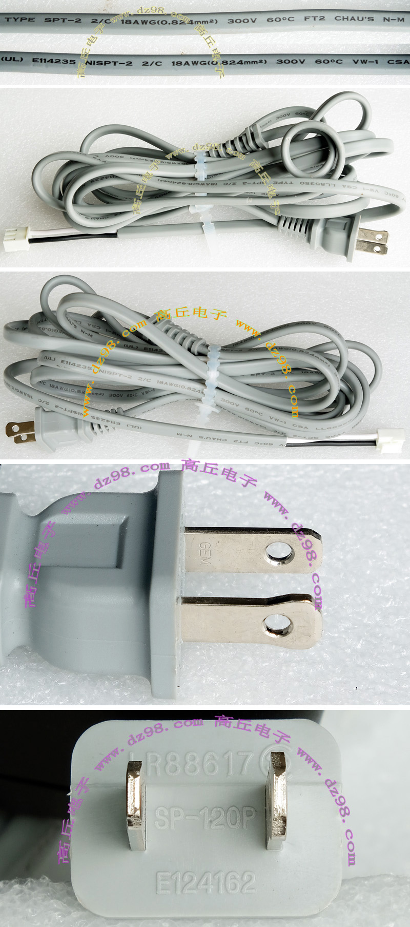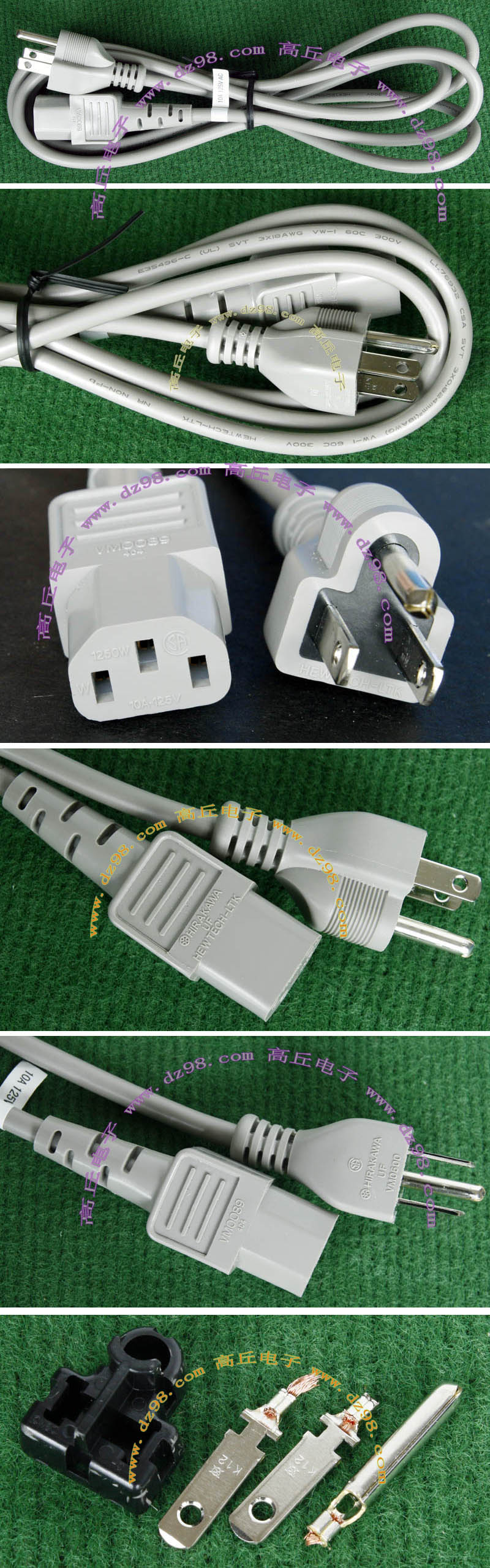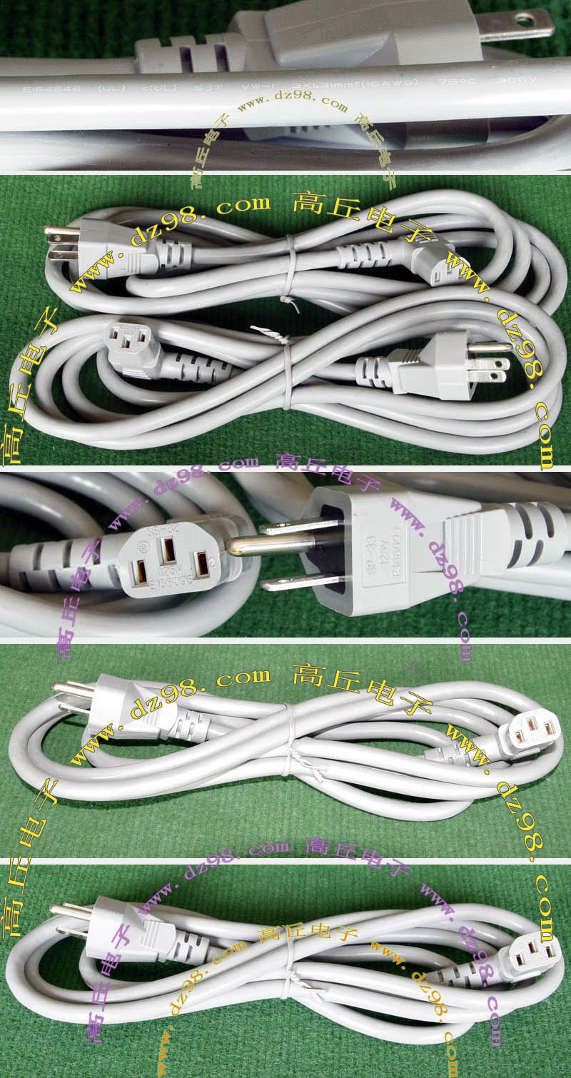 全新库存,外观9成新,长度2.5米,重量约310克。做工不错,线外皮直径9毫米,插头标字125V,可以用220V,电线外皮文字:E164646 (UL) c (UL) SJT VW-1 3X1.31MM2<代表内线由3条1.31平方毫米铜线结构> (16AWG)75摄氏度 300V。 | - |