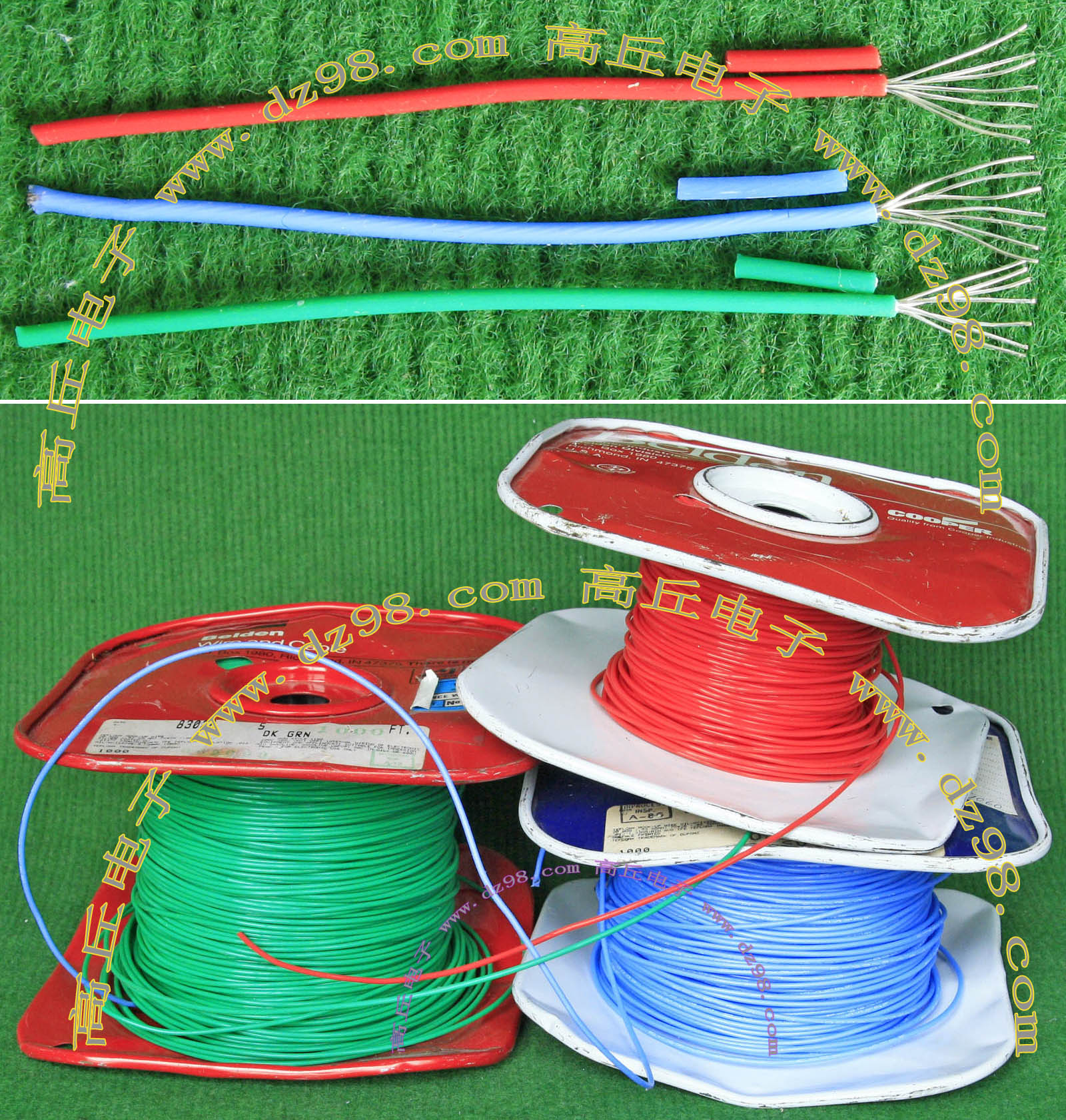 进口高品质镀银线,机箱内部布线,外皮特副龙耐温材料,有3种颜色,蓝、绿、黄(图片黄色没有拍照)。镀银铜线由7条直径0.3毫米组合,带皮直径约1.75毫米。 红色无货 |