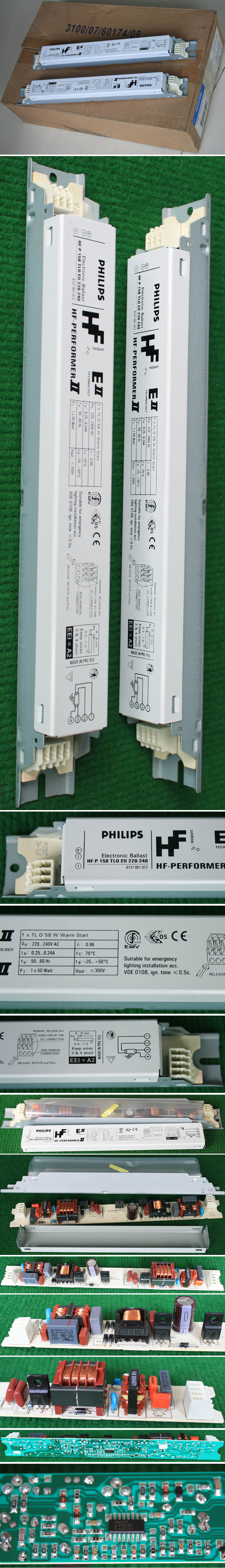 全新 | 全新飞利浦HP-P258荧光灯电子镇流器,MADE IN P.R.C. PLE,每箱包装数量12只。输入电压AC220-240V,高效能输出,同时接两支功率58W以内荧光灯管。 外形尺寸;长280毫米、宽30毫米、高28毫米,重量约225克。 |