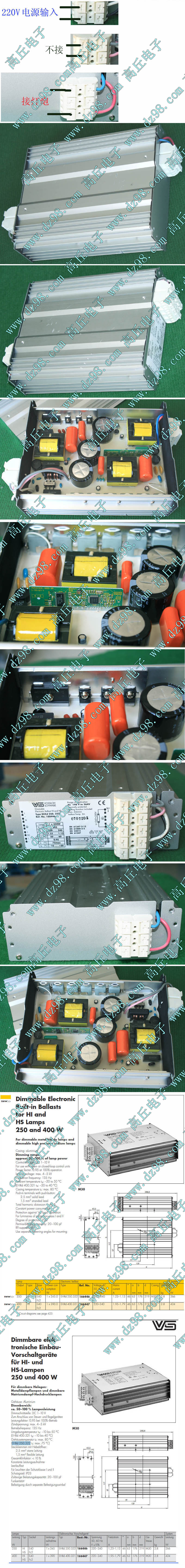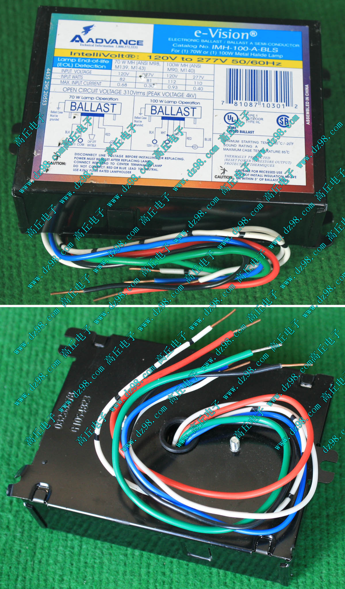 可以与70W以内各种金卤灯炮配合使用。外形尺寸:150x80x35毫米,每只重量约510克。 输入原配接有标称250V-7.5A带三角插头一体电源线(长度160厘米),输出接有30厘米长度三角插座(此插座与国内的不一样,要把中间的接地脚剪掉才能插上),输出插座是接高电压金卤灯炮用,中间地线可以不接。 |