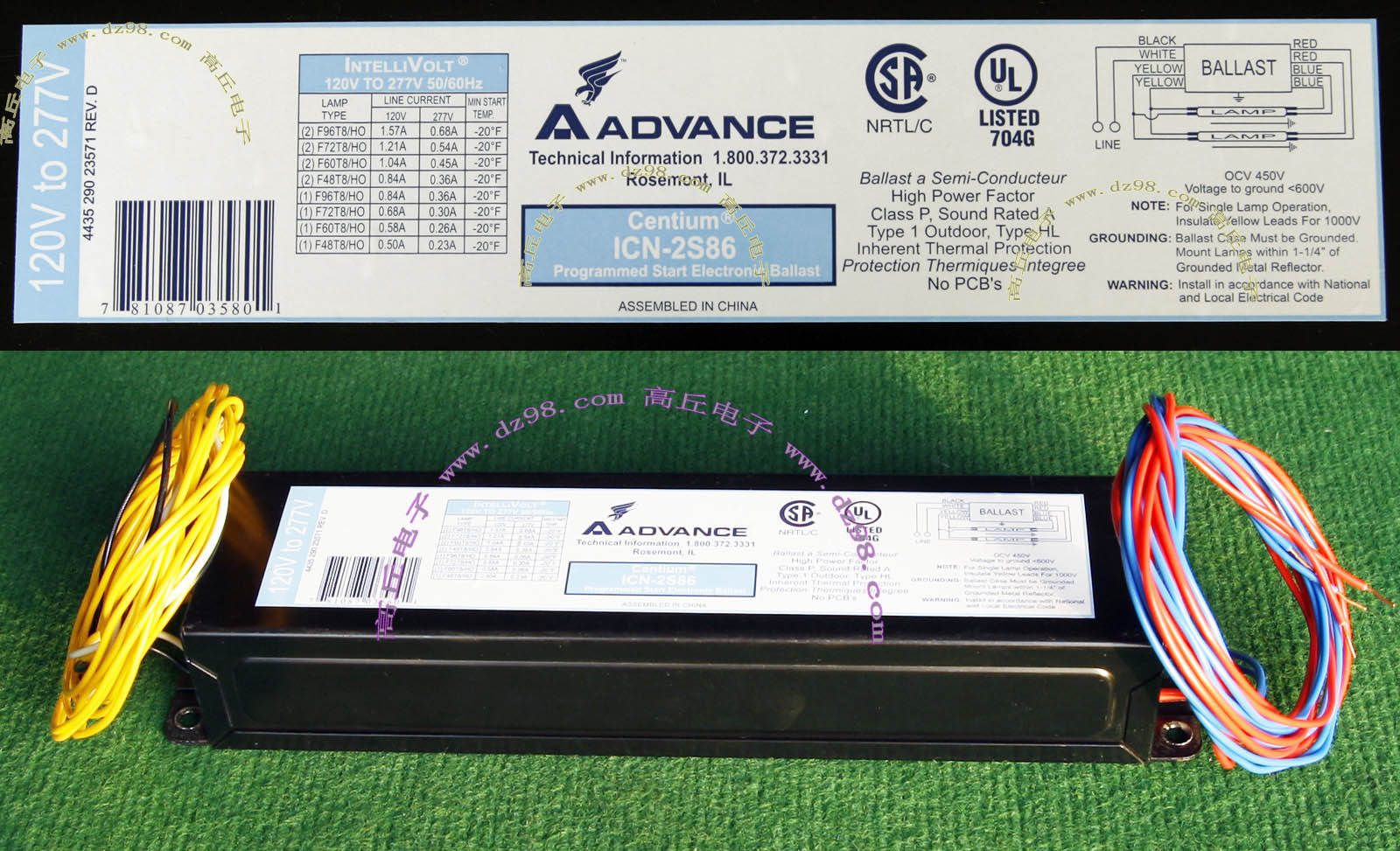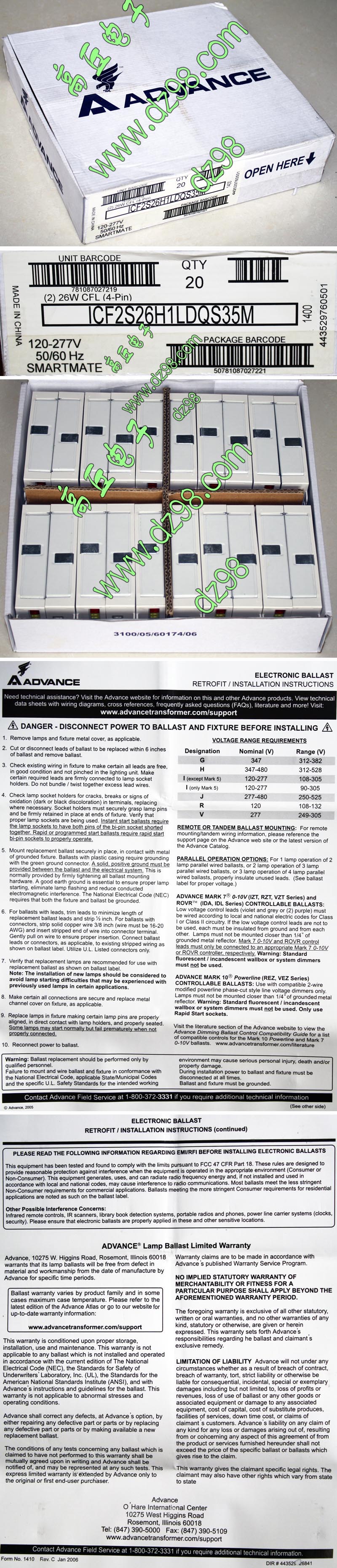 每箱包装数量20只,全新原装品,有内部清晰结构图片为证,出厂没有对每只独立套上塑料袋,导致都有摩擦痕迹,厂牌:ADVANCE,极广宽的电源输入电压120V-277V,型号ICF-2S26-H1-LD-QS,外形尺寸:126x60x25毫米,重量约177克。 对应同时接2只16W-26W或者1只32W-42W H型日光灯管。 |
