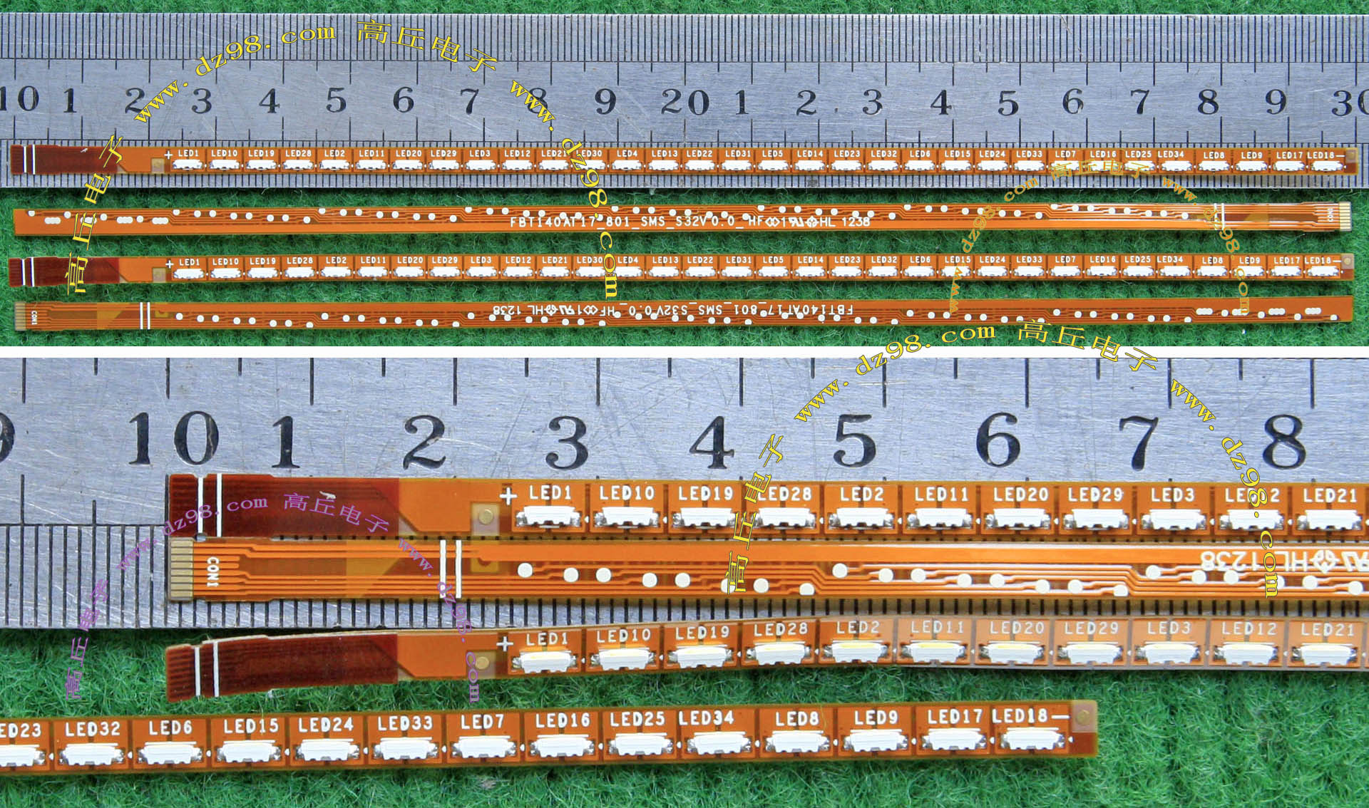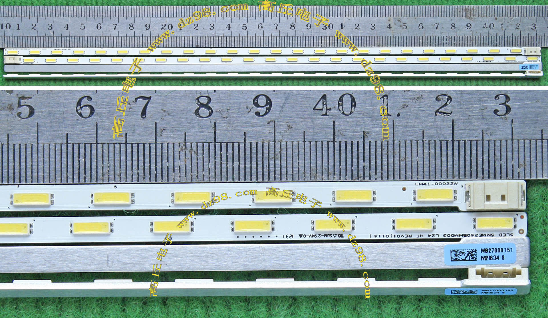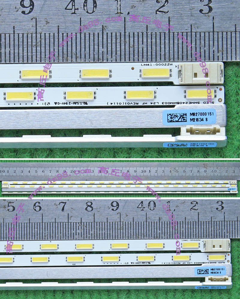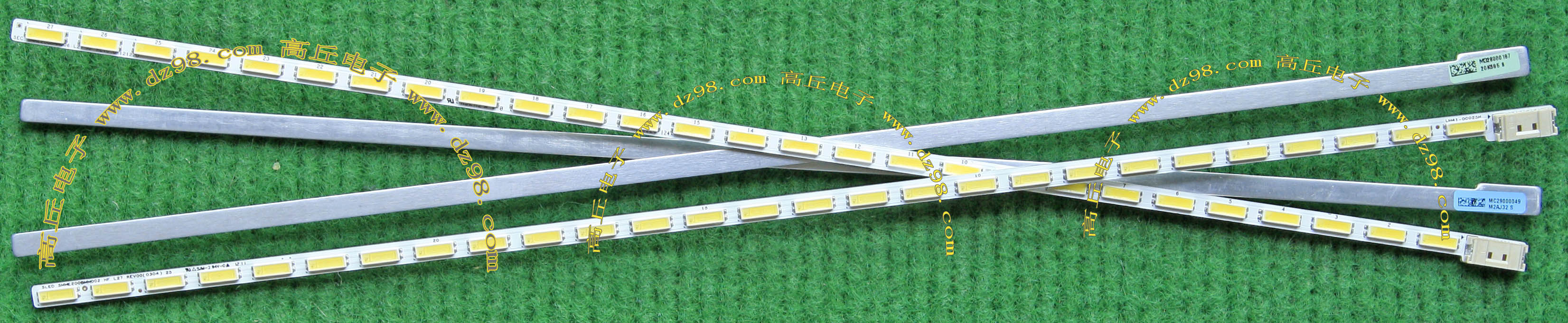 全新库存,自动化精密贴片机焊接,采用三星原装LED发光芯片,此成品发光条原本用于窄边框电视机或显示器作为背光照明,发出白光非常鲜明,具有超薄、超窄、光线柔和、寿命长的特点。 长度610毫米,宽度5.4毫米(接线处最宽6.8毫米),连铝基板厚度2毫米,64只三星白光LED,每只LED不含焊脚尺寸;6.4x2.15毫米。 |