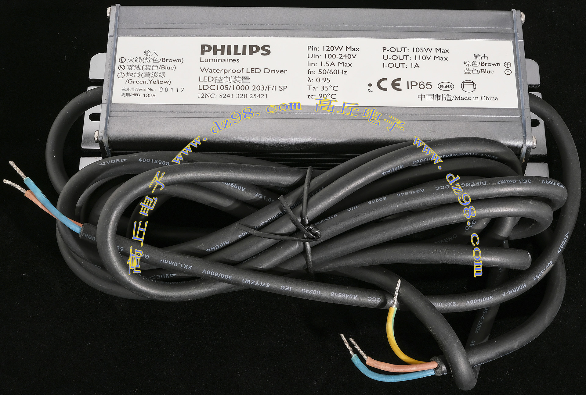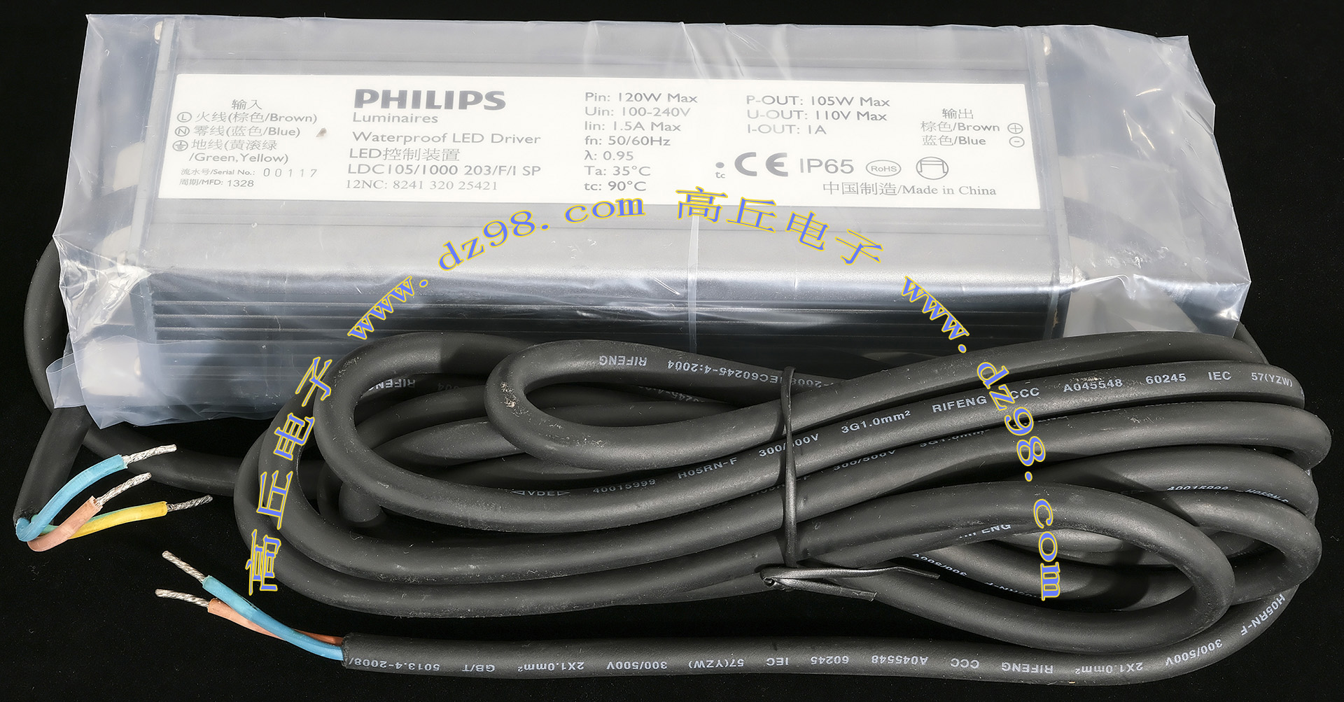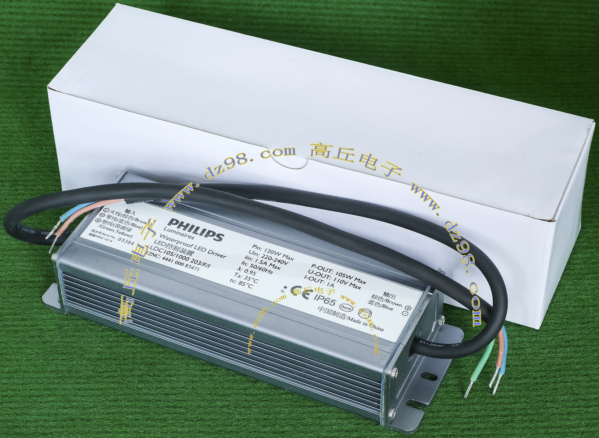全新LED恒流驱动电源,防水等级IP65,输入AC220-240V,内置PFC功率因数校正电路,输出DC110Vmax,限流1A,功率105Wmax。外形尺寸;193x67x38毫米,重量约1080克,输入电源线长度260厘米,输出电源线长度30厘米。 另有一种输入电源线长度340厘米,型号LDC105/1000 203/F/I SP。 |
