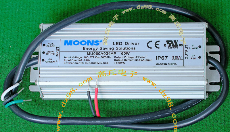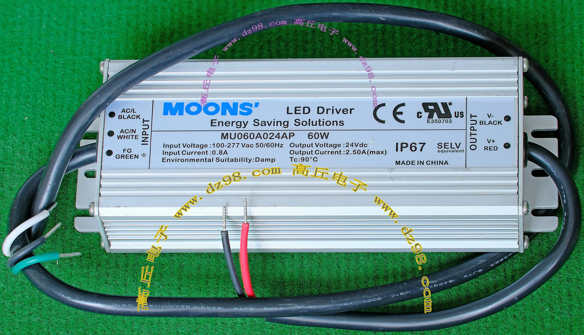 | MOONS 24V 2.5A 60W LED灯驱动器恒流电源AU088 | 全新 | 全新LED恒流驱动电源,防水等级IP67,输入AC100-277V,内置PFC功率因数校正电路,输出DC24V,限流1Amax,功率60W。外形尺寸;190x68x38毫米,重量约795克,输入电源线长度60厘米,输出电源线长度20厘米。 |