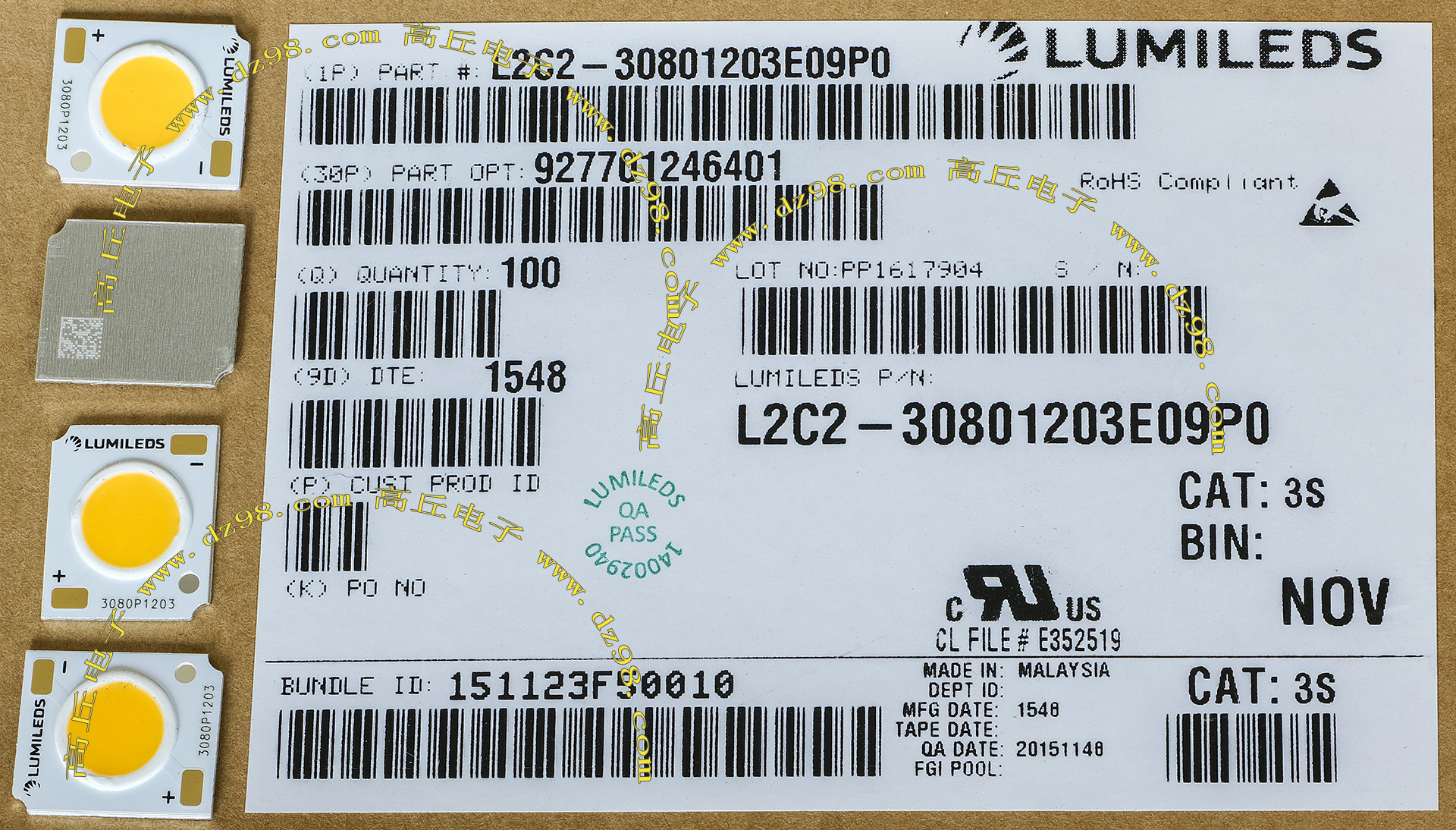 全新原装,厂牌;LUMILEDS,3种型号尺寸一样;19x16x1.5毫米。 L2C2-30801203E09P0,色温3000K,数量211只。 L2C2-30901203E09P0,色温3000K,无货。 L2C2-40801203E0900,色温4000K,数量491只。 |