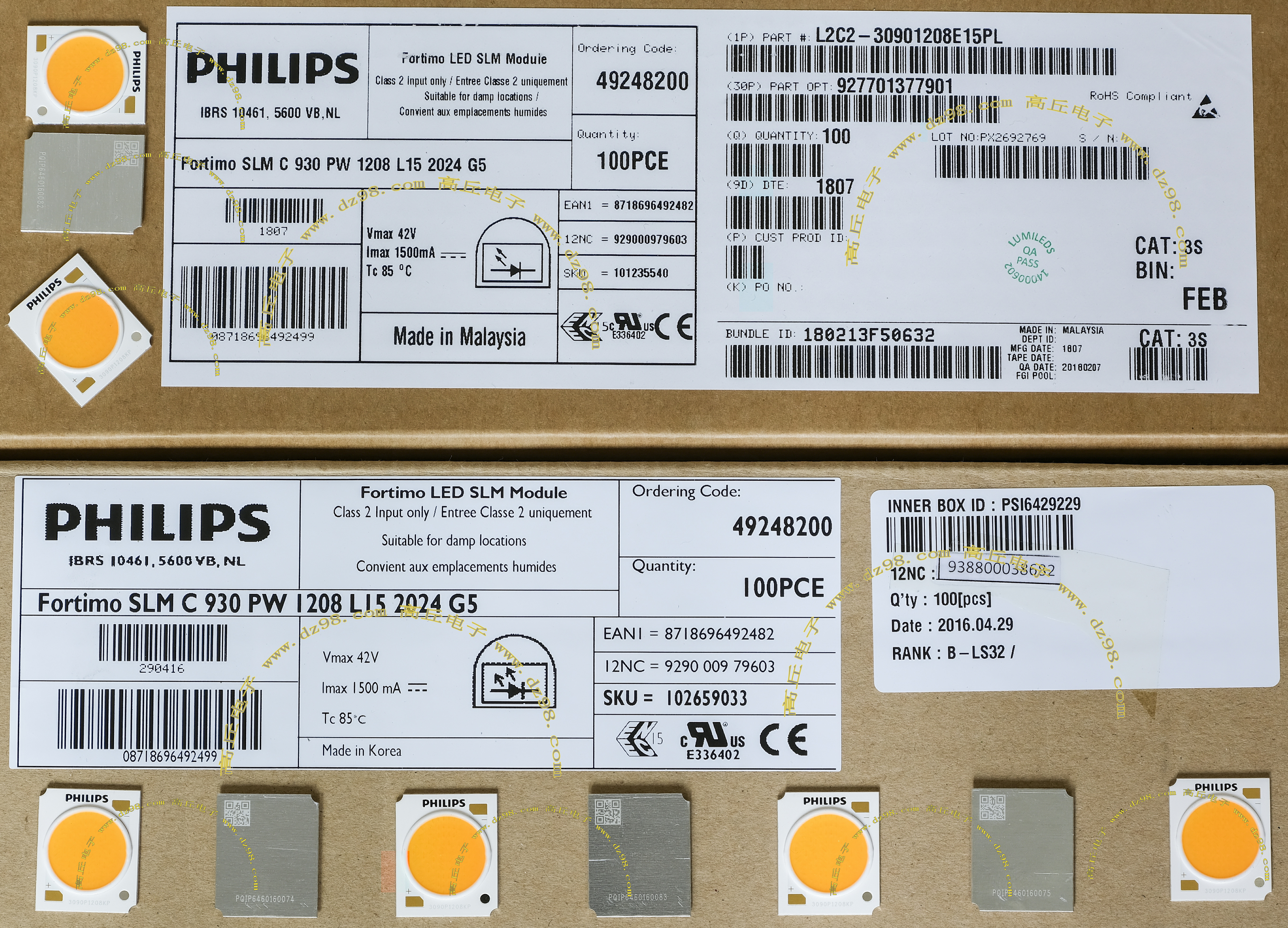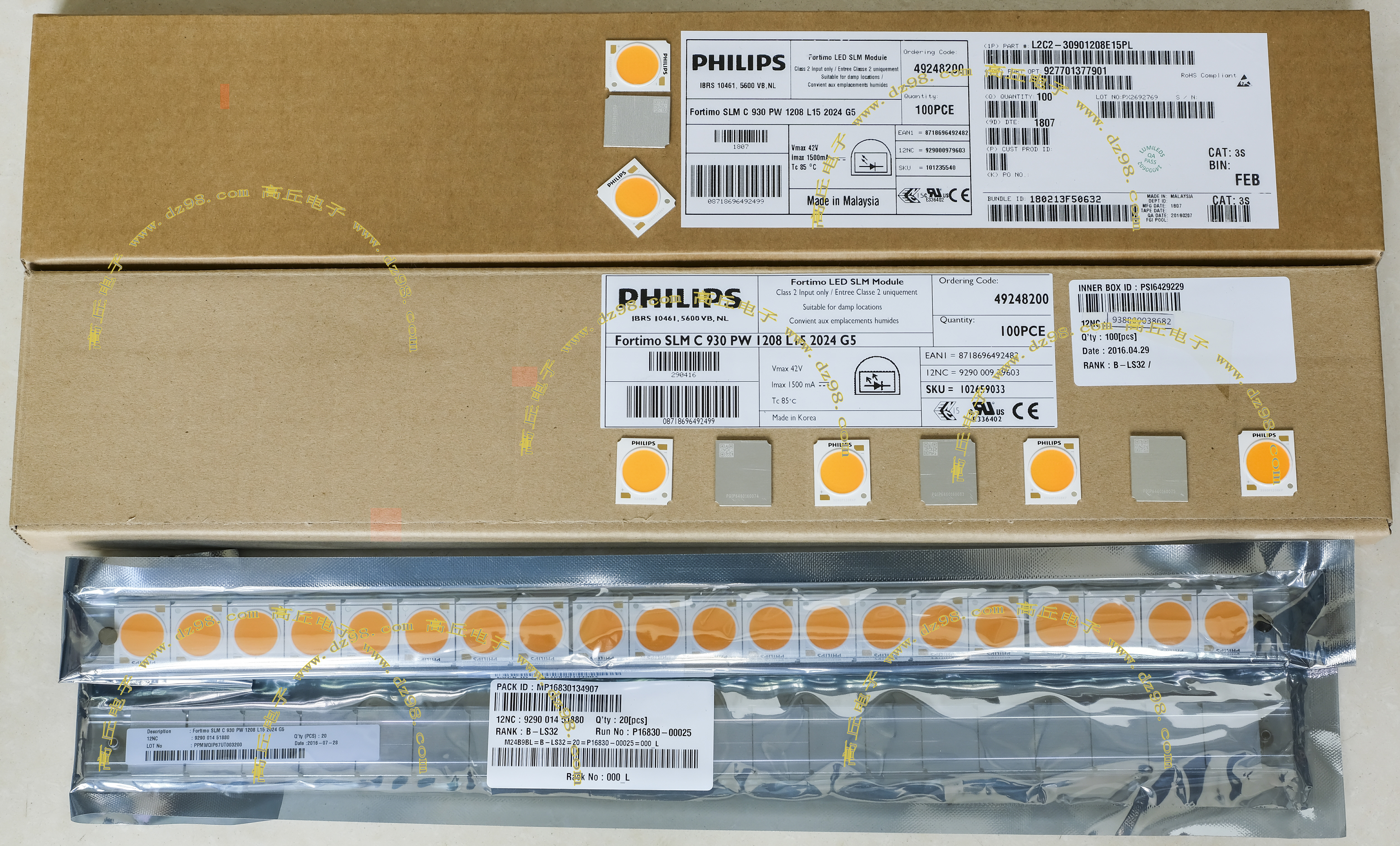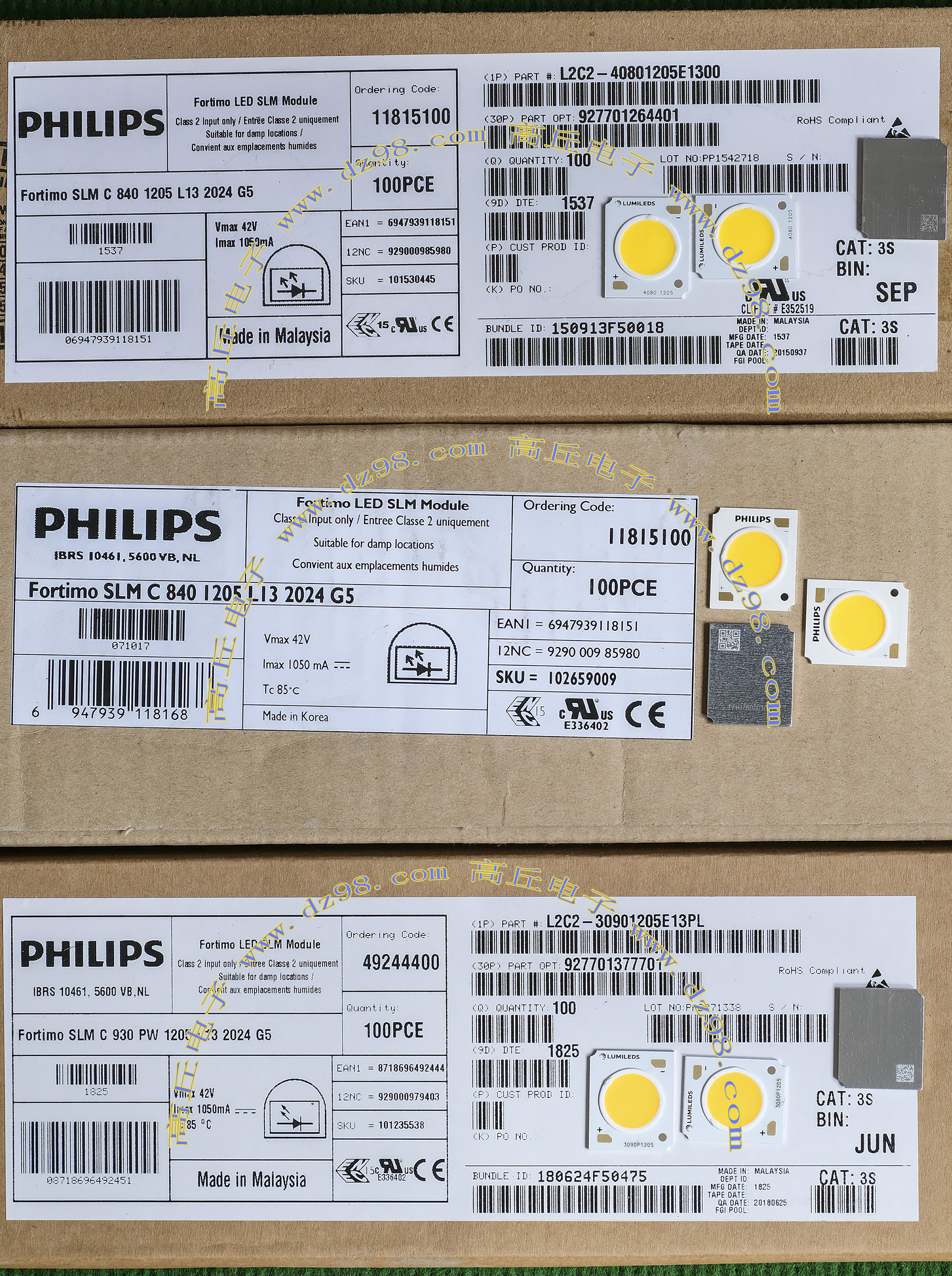 全新原装,厂牌;PHILIPS/LUMILEDS,生产公司;LUMILEDS,尺寸;20x24x1.5毫米,Vmax42V、Imax1050mA、Tc85摄氏度,产地;Korea或Malaysia。 LUMILEDS 4080 1205,色温4000K,数量100只。 PHILIPS 4080 1205KP,色温4000K,数量78只。 LUMILEDS 3090P1205,色温3000K,数量2872只。 |