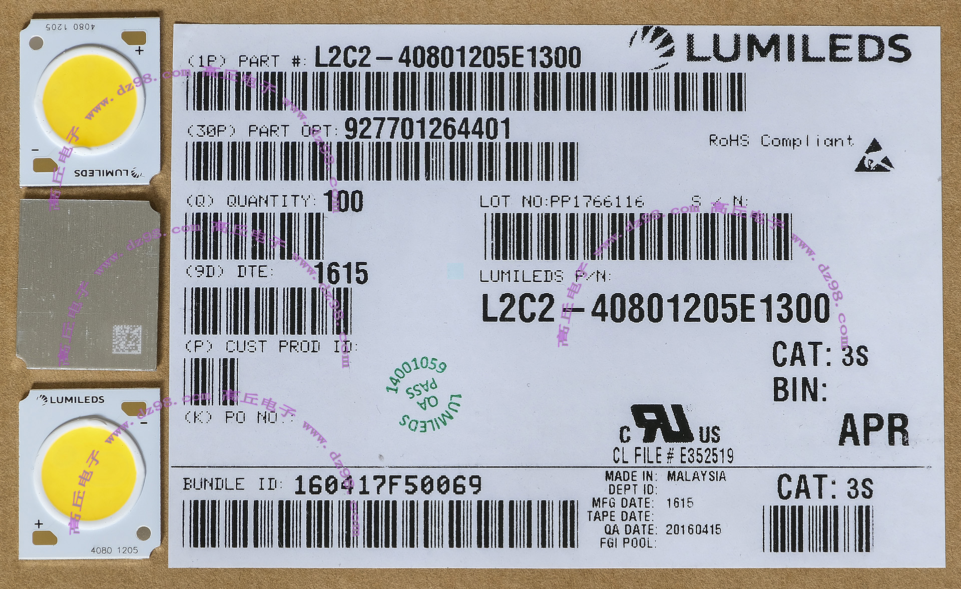 | 原装LUMILEDS 40801205E1300 LED COB广角照明灯 片AU096 | 全新 | 全新原装,厂牌;LUMILEDS,尺寸;20x24x1.5毫米,色温4000K,产地;Malaysia或Korea。 |