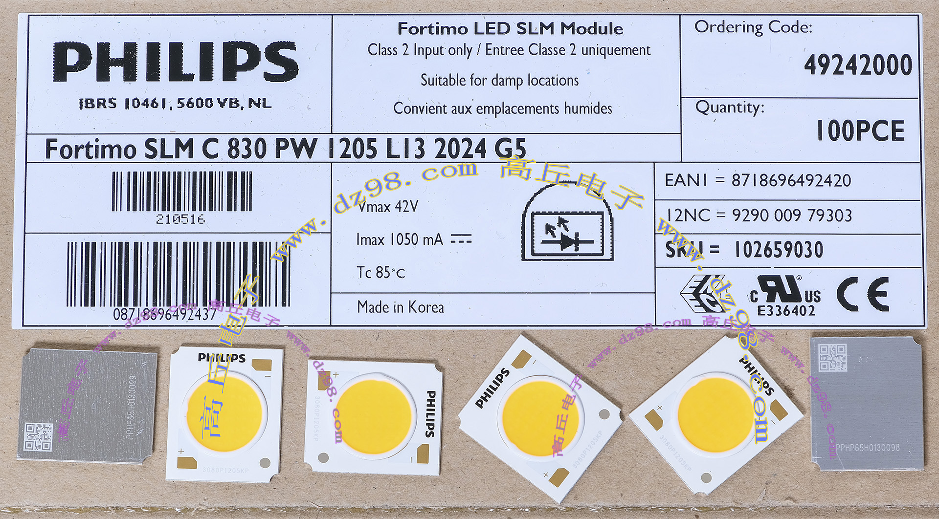 | 原装PHILIPS 1205L132024G5 LED COB广角照明灯片AU098 | 全新 | 全新原装,厂牌;PHILIPS,生产公司;LUMILEDS,尺寸;20x24x1.5毫米,Vmax42V、Imax1050mA、Tc85摄氏度, 色温3000K,产地;Korea或Malaysia。 |