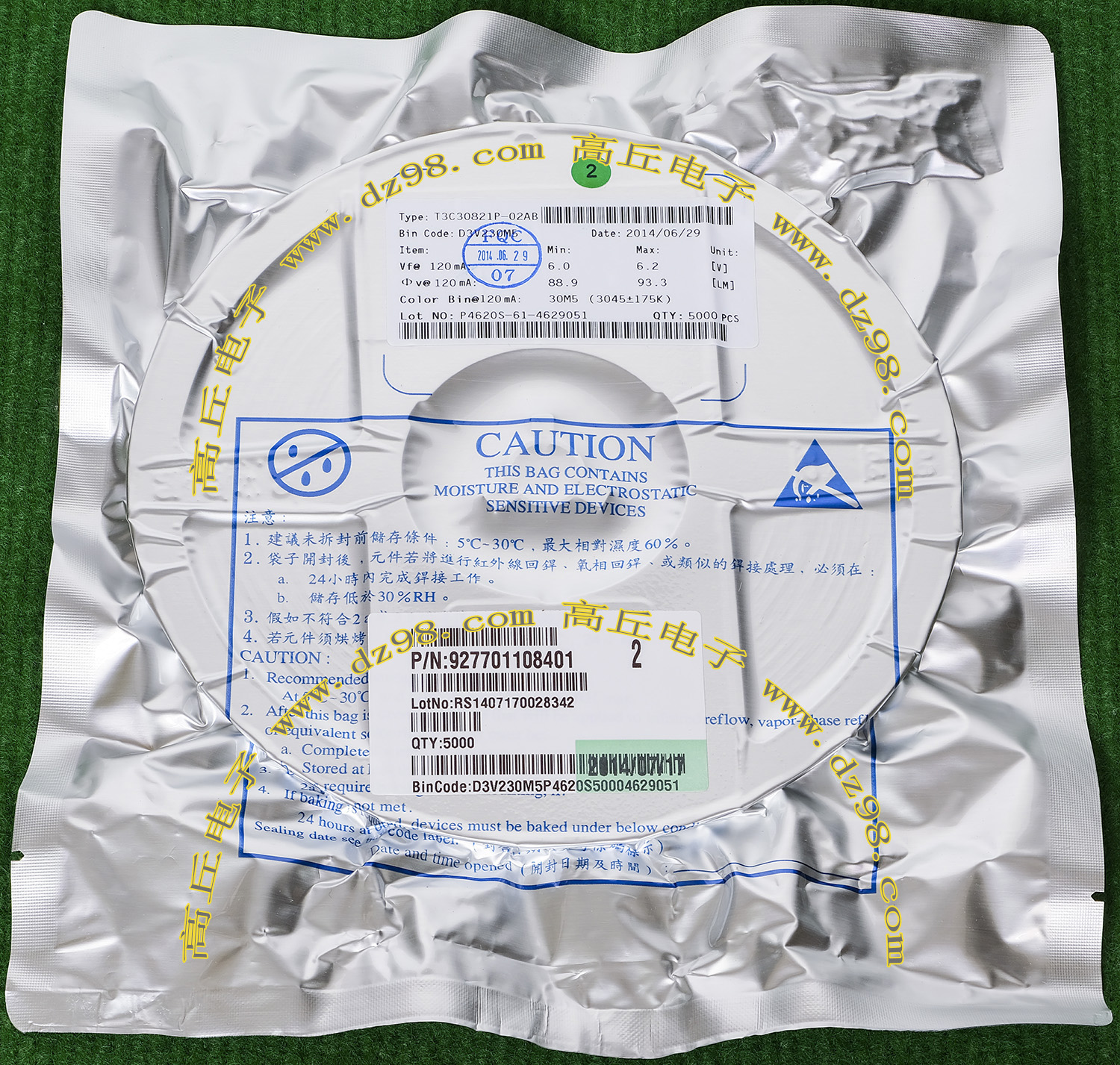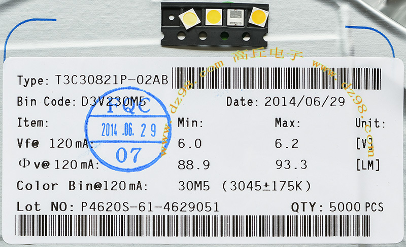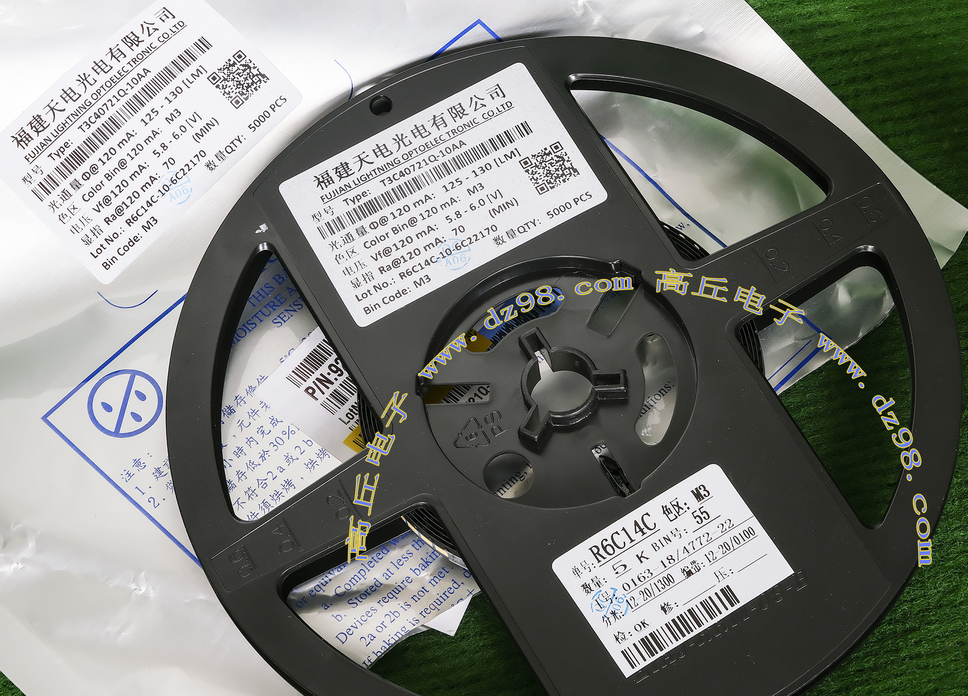 | T3C30821P-02AB D3V230M5 LED 广角照明灯片AU101 | 全新 | 全新原装,尺寸;3x3x0.5毫米,6-6.2V、120mA、84.5-88.9LM、色温3045K(+-175K),每盘真空包装数量5000只,每盒包装2盘。 |