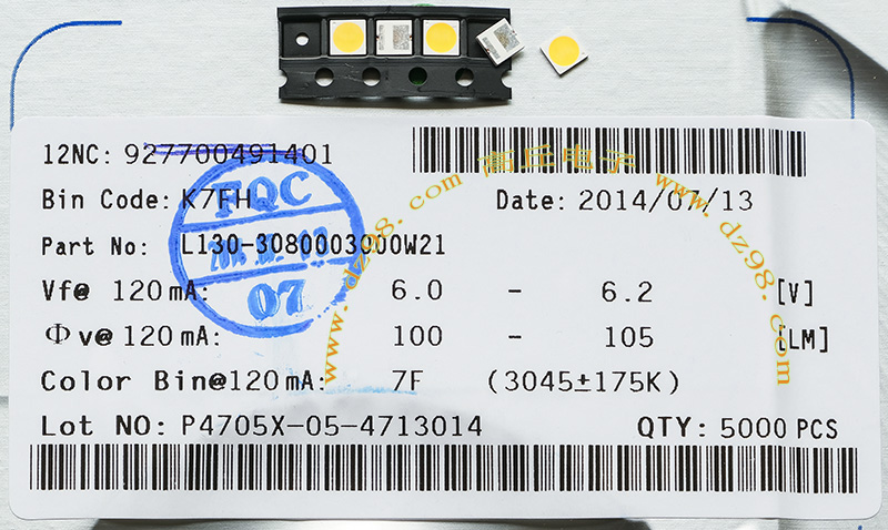 | L130-40800030000W21 LED 广角照明灯片AU103 | 全新 | 全新原装,尺寸;3x3x0.5毫米,6-6.2V、120mA、95-100LM、色温3985K(+-275K),每盘真空包装数量5000只,每盒包装2盘。 |