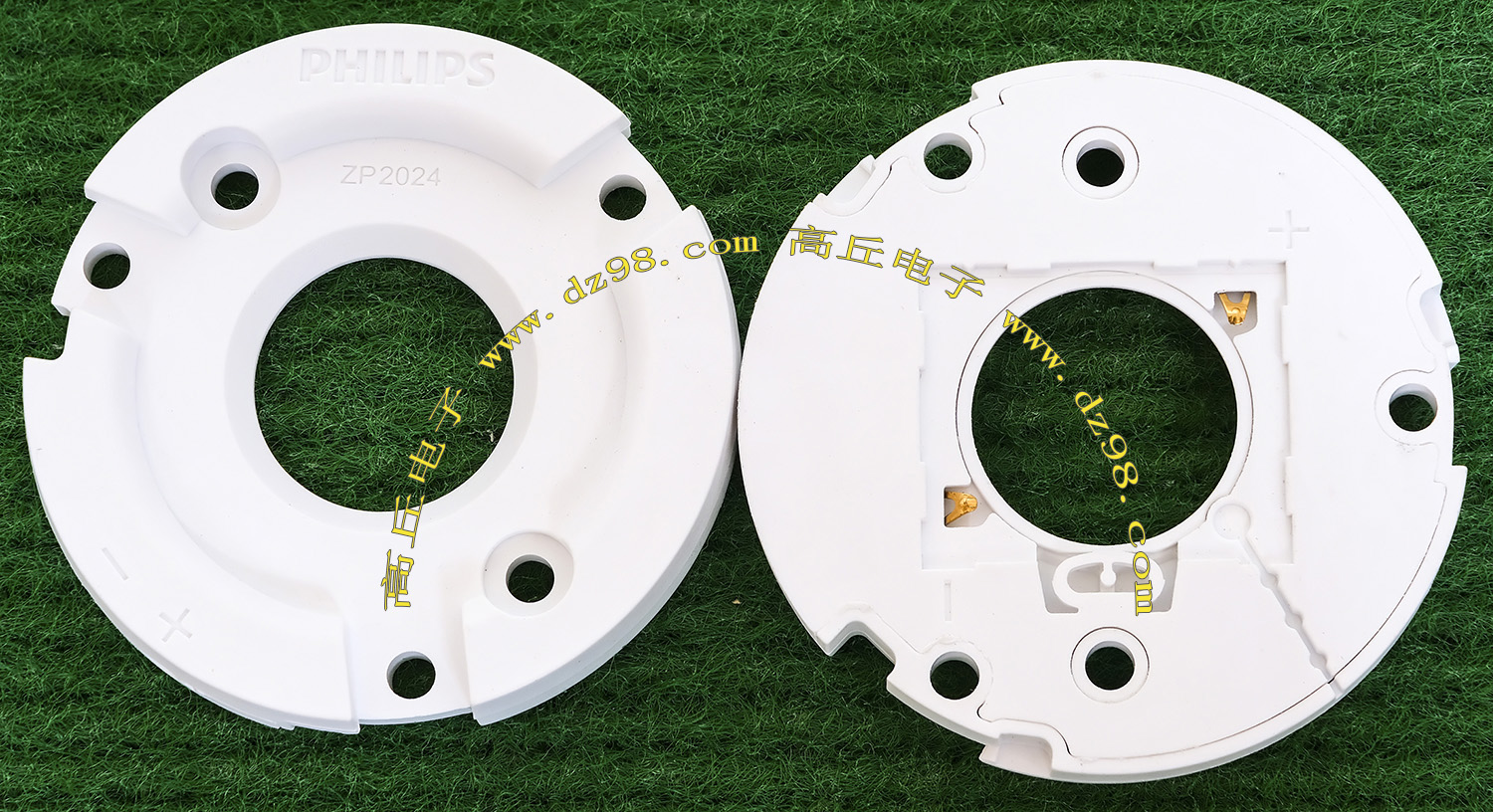 全新LED固定座,每盒包装数量20只,耐温绝缘材料制品,镀金接触片,对应安装LED灯片尺寸;24x20x1.5毫米。外形尺寸;直径50毫米,厚度6.7毫米,
